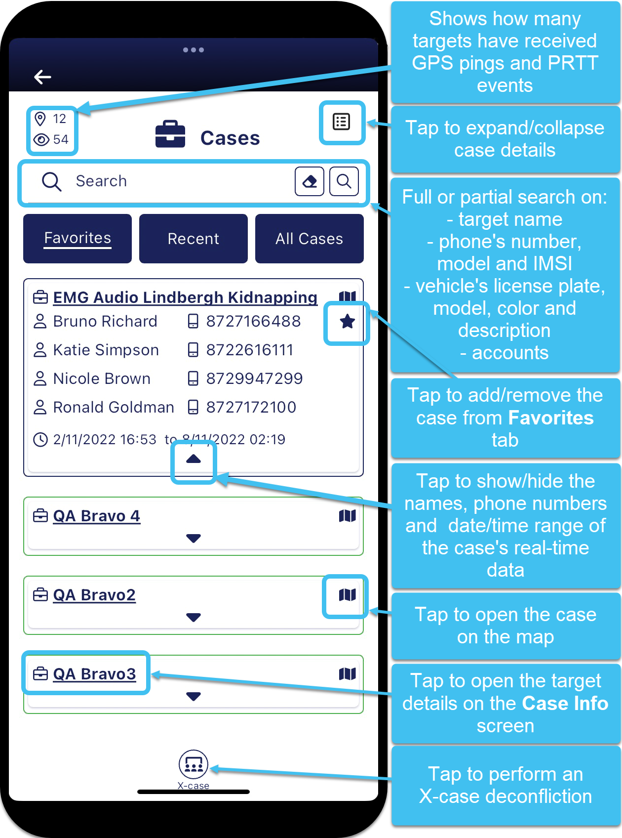 allows you to tap a case name to open the Case Info screen. The Case Info screen then allows you to select which of the case's phones you want displayed on the map, and view and filter each phone's events.