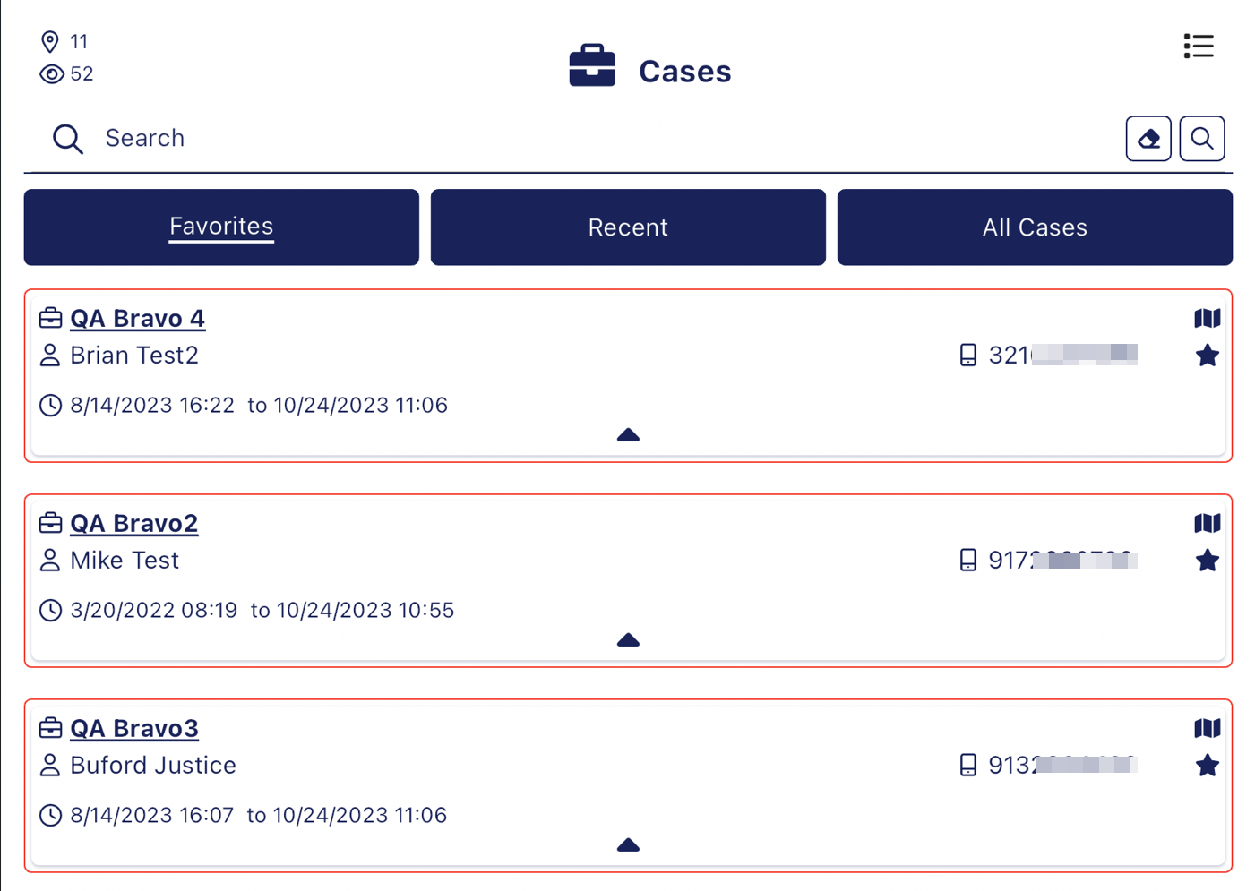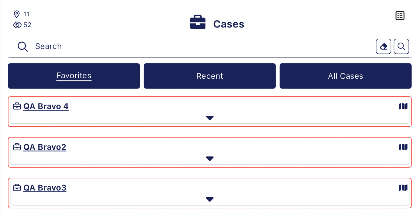 There are three tabs on the screen which allow you to display either your favorite, recent or all your cases.