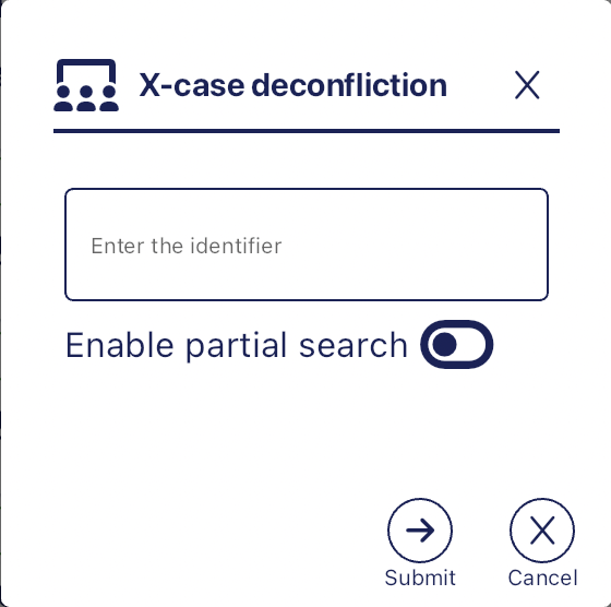 to open the X-case deconfliction pop-up that allows you to search for phone numbers across cases on your account. For further information refer to How to run an X-Case deconfliction.
