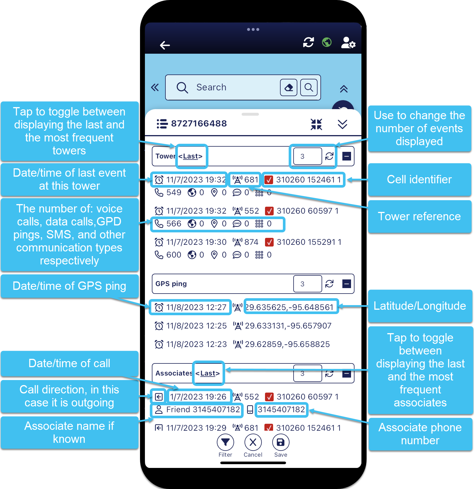 By default the panel displays the last 3 events for the last towers, GPS ping and last associates. You can easily change the number of events displayed, and you can toggle between displaying the last and most frequent towers, and the last and most frequent associates.