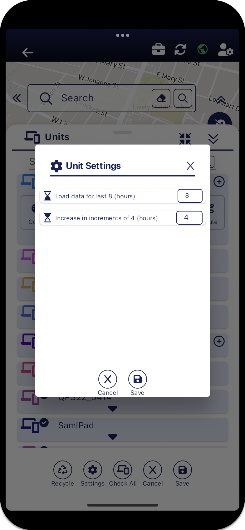 Tap to remove the selected unit's breadcrumb trail from the map. Only the unit's current location is now displayed on the map and the number of hours of data displayed is reset to 0h.