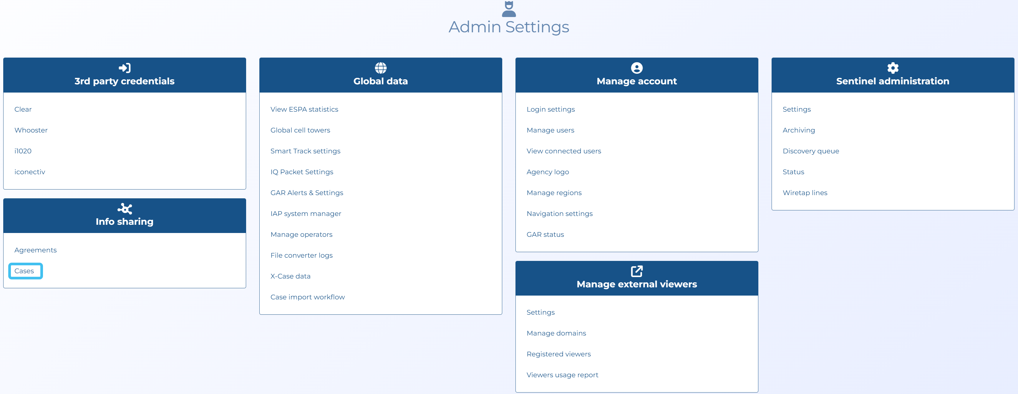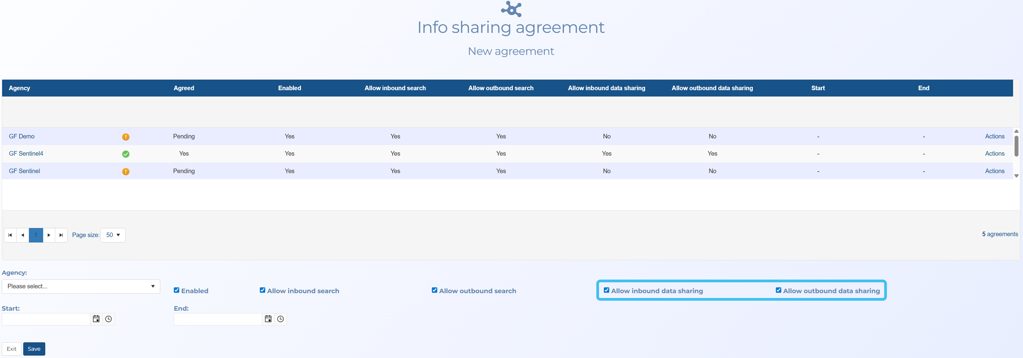 Administrators can manage data sharing using the Info sharing agreement and Info sharing summary screens. These screens are opened from the main menu by clicking Settings, Admin settings then selecting either Agreements or Cases respectively in the Info sharing group. To share data between accounts you must first select Allow inbound data sharing and Allow outbound data sharing on the Info sharing agreement screen. Once data has been shared to your account you must then configure which case uses the data and resolve any conflicts using the Info sharing summary.