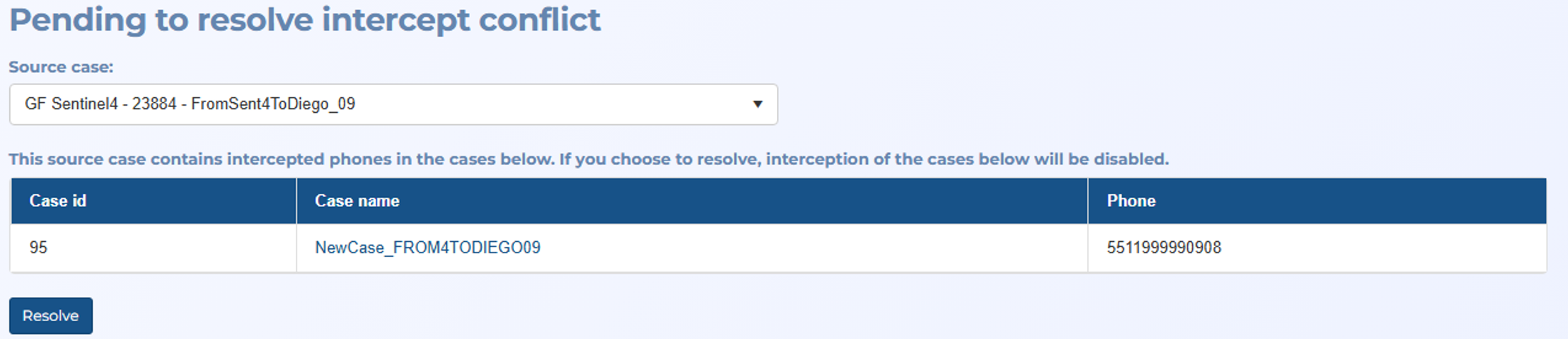 If a new intercept arrives for an existing case you will receive the message below detailing that if you click Resolve all cases receiving the existing intercept in your account will be disabled.