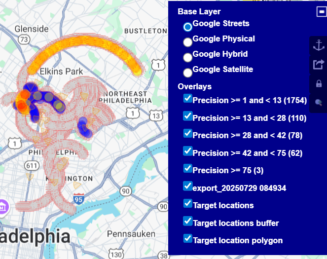 The exported map, including the precision location analysis is now displayed on the map. You can use the map layers to show/hide the various precision layers.