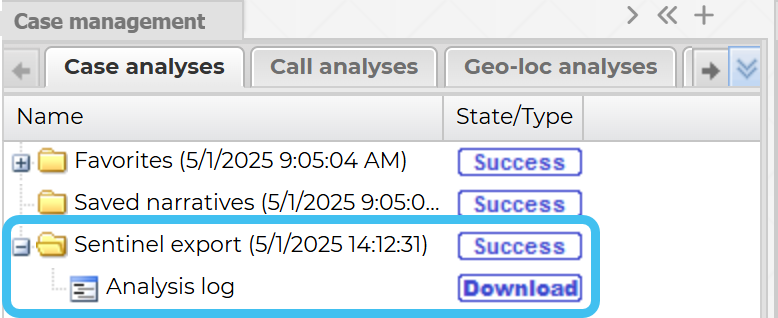 A Sentinel export folder immediately displays on the Case analysis tab of the Case management view. The map export is available for use when the state changes from Running to Success.