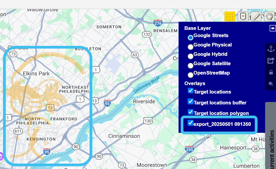 The exported map, including the TA arcs are now displayed on the map. You can use the map layers to show/hide the exported file.