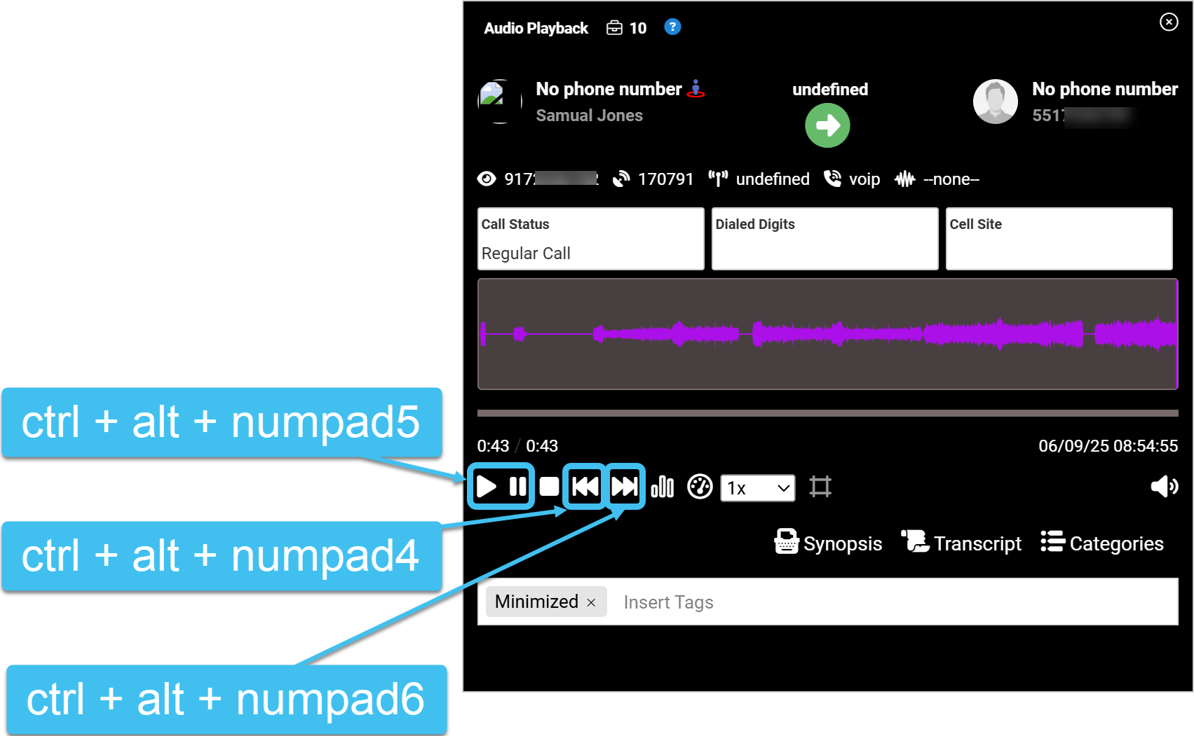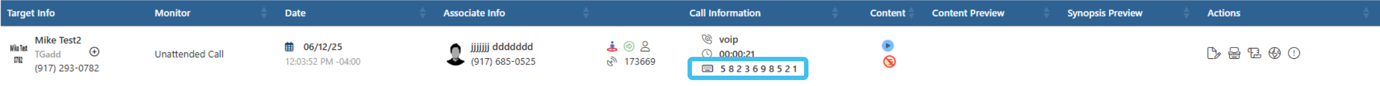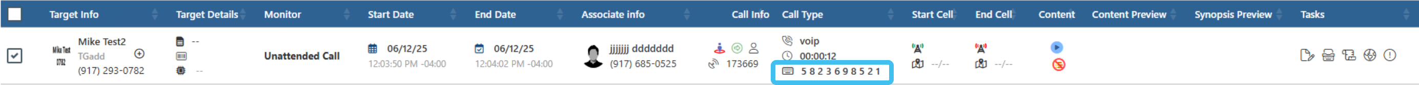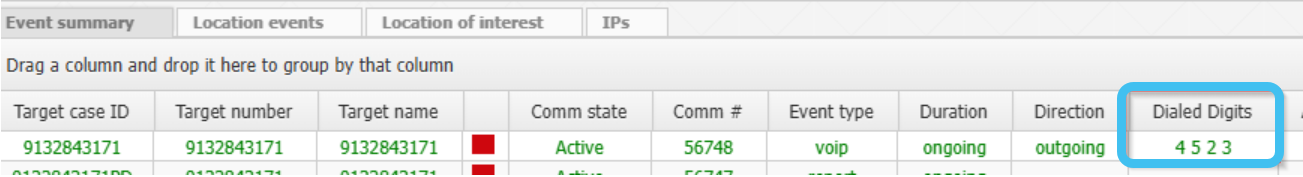 You can now view dialed digits for both PRTT and T3 calls on a number of screens, and in the Live target summary IQ packet; previously they were only available for a monitor to view on the Audio player window when replaying a T3 call. Dialed Digit Extraction (DDE) occurs when the intercept subject dials or signals digits in the VoIP content stream. The dialed digits are now also available on: