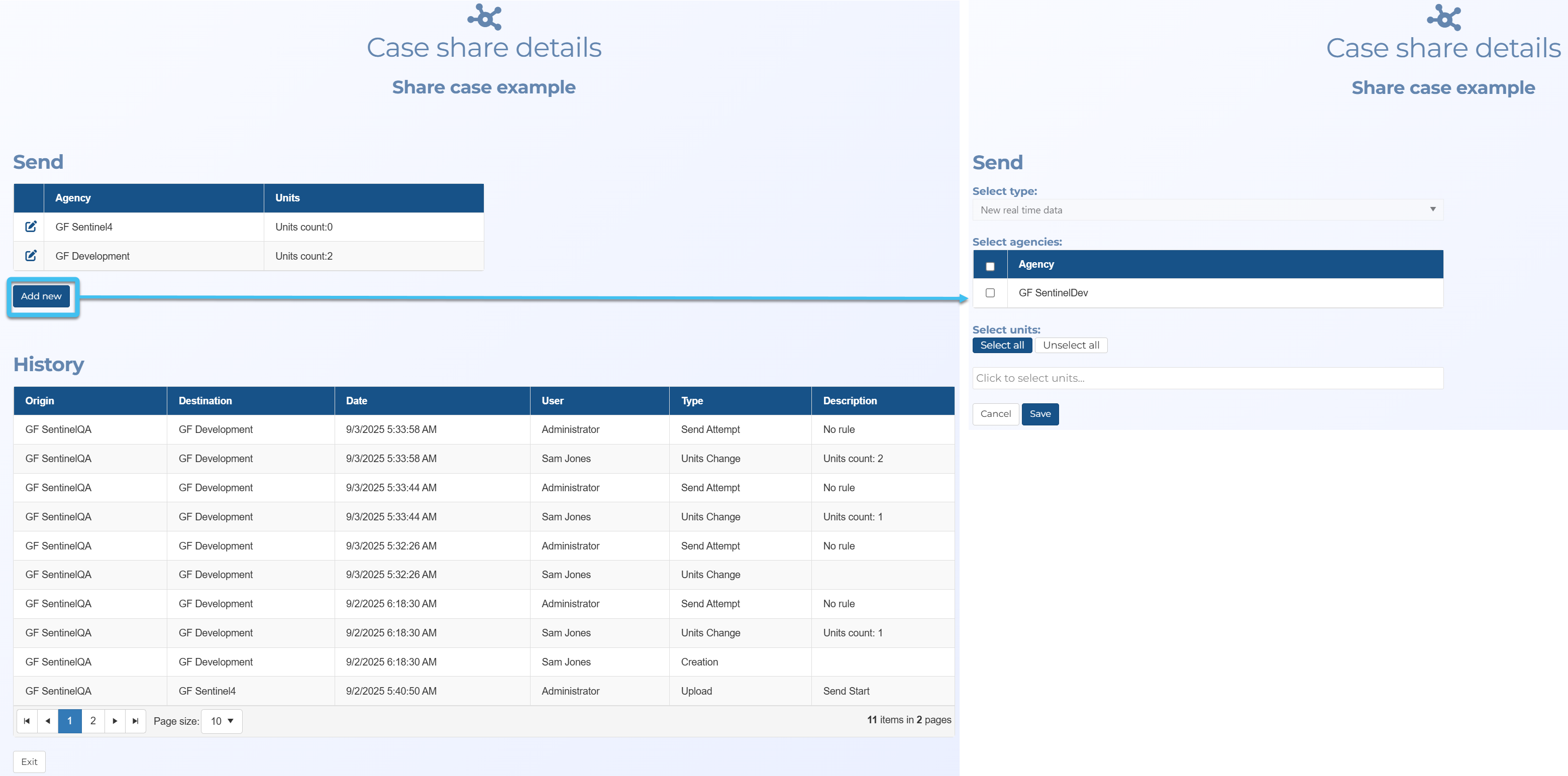 You can now share case data with other agencies or G-Scout units. This is done using the new Case share details screen which is opened by clicking Share on the Manage case screen.