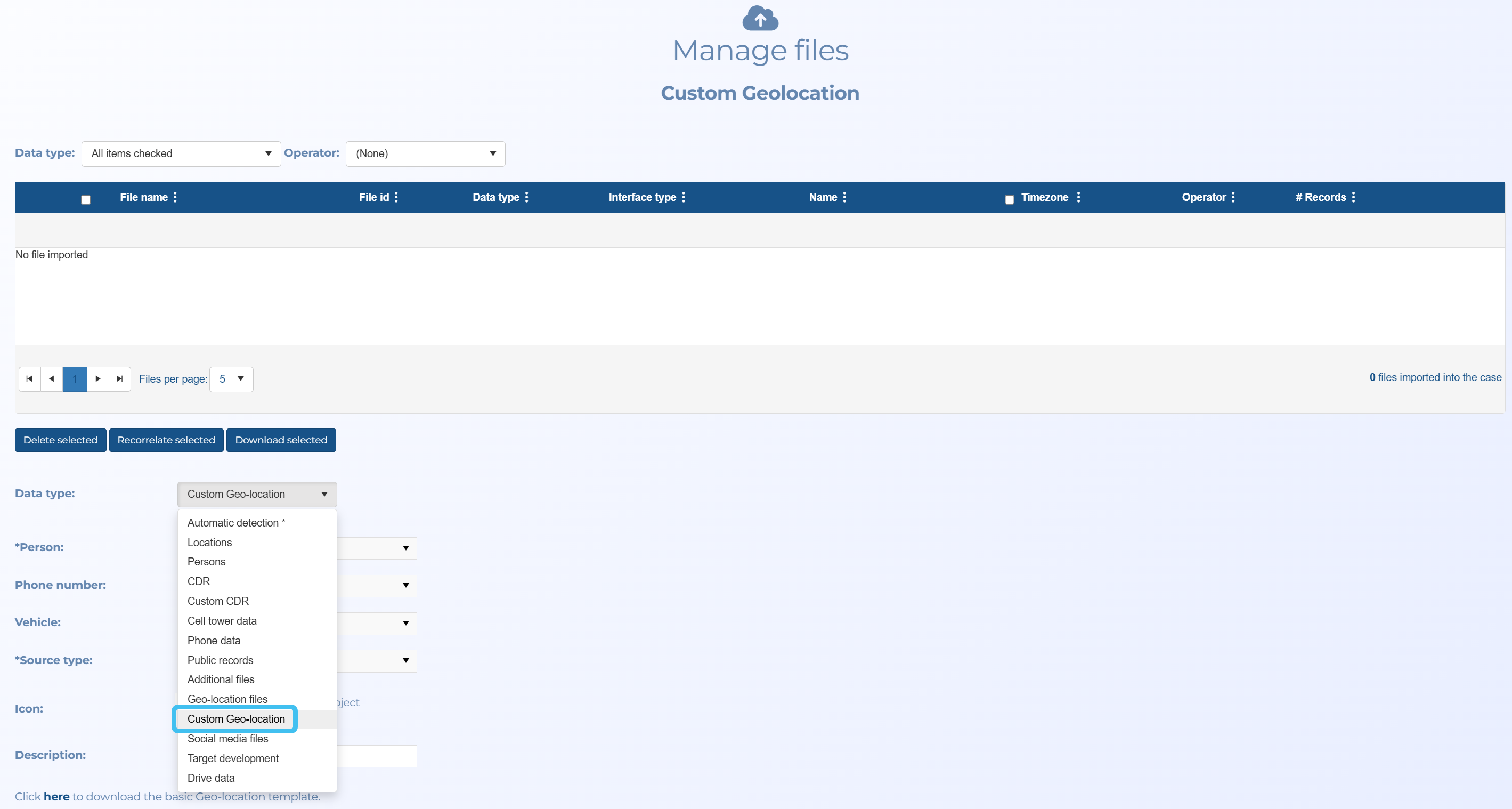 You can now customize your own geolocation imports using the new Custom Geo-location option on the Manage files screen. This is useful as geo-location files come in many different formats, such as from phones, car navigation, notebooks, and smart watches, and this option allows you to customize your own import templates to support the different formats.