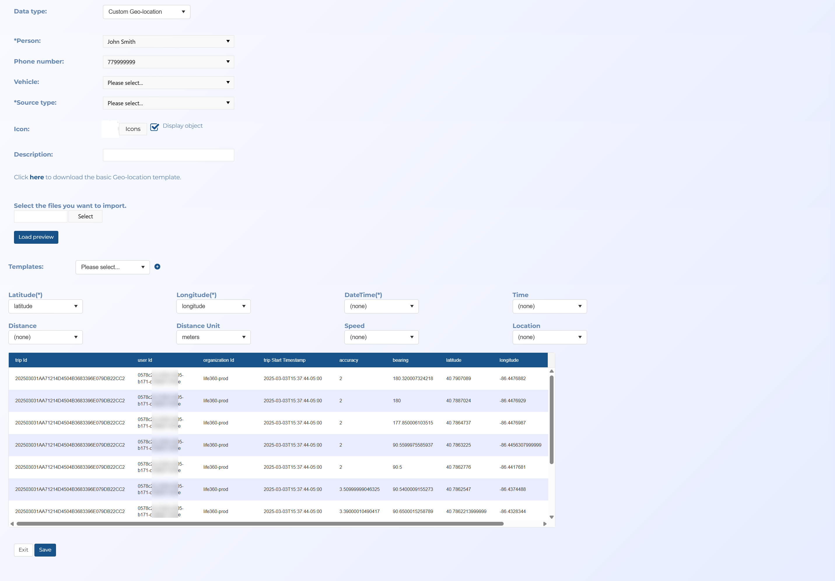 The files are uploaded to a predefined person as either file type .xlsx, .xls or .csv. These are the same as geo-location files but with this option your file's column headers can be named whatever you want. When you upload the file, the Manage files screen provides you with a preview of the uploaded file and allows you to define which columns map to each of the OSS-ESPA settings. Latitude, Longitude and DateTime are mandatory. OSS-ESPA automatically suggests the best mapping but you can change that if required. You can also save this mapping as a template for future use.