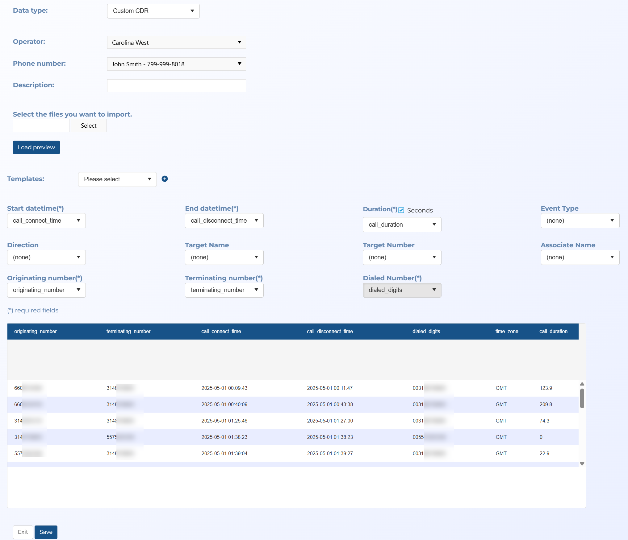 The files are uploaded to a predefined phone number as either file type .xlsx, .xls or .csv. The Manage files screen provides you with a preview of the uploaded landline file and allows you to define which columns map to each of the OSS-ESPA settings. Start datetime, End datetime, Duration, Originating number, Terminating number and Dialed number are mandatory. OSS-ESPA automatically suggests the best mapping but you can change that if required. You can also save this mapping as a template for future use.