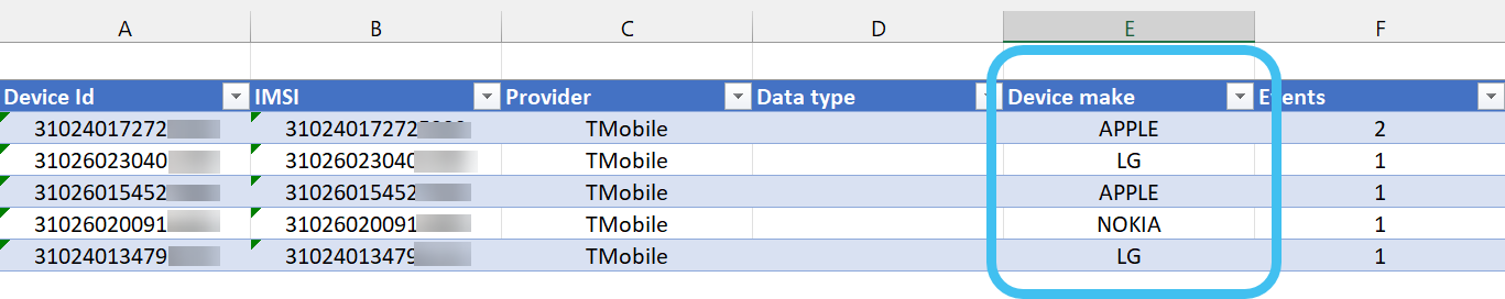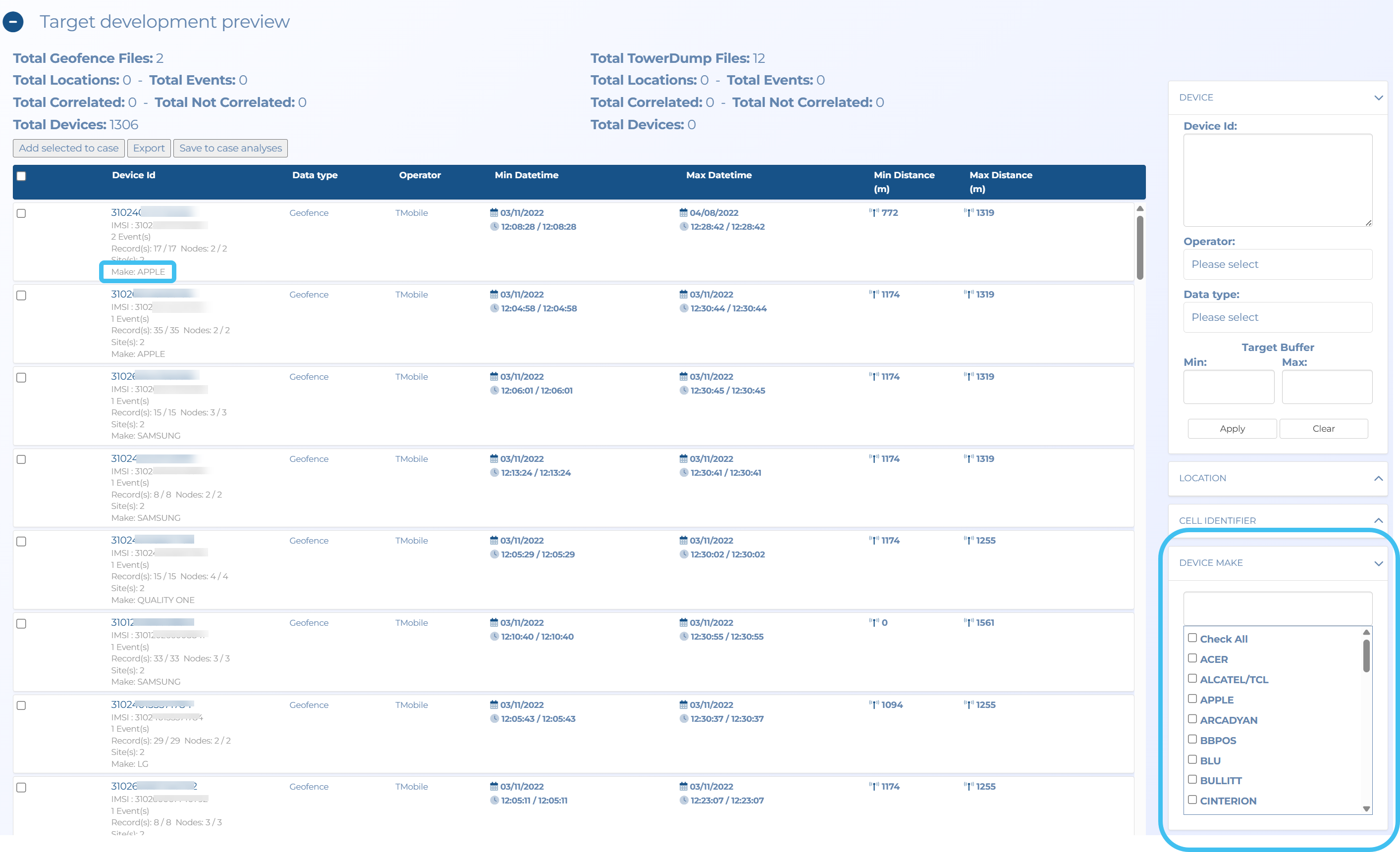 A Device make column has also been added to the Target Development (Through Geofence/Tower dump) IQ packet.