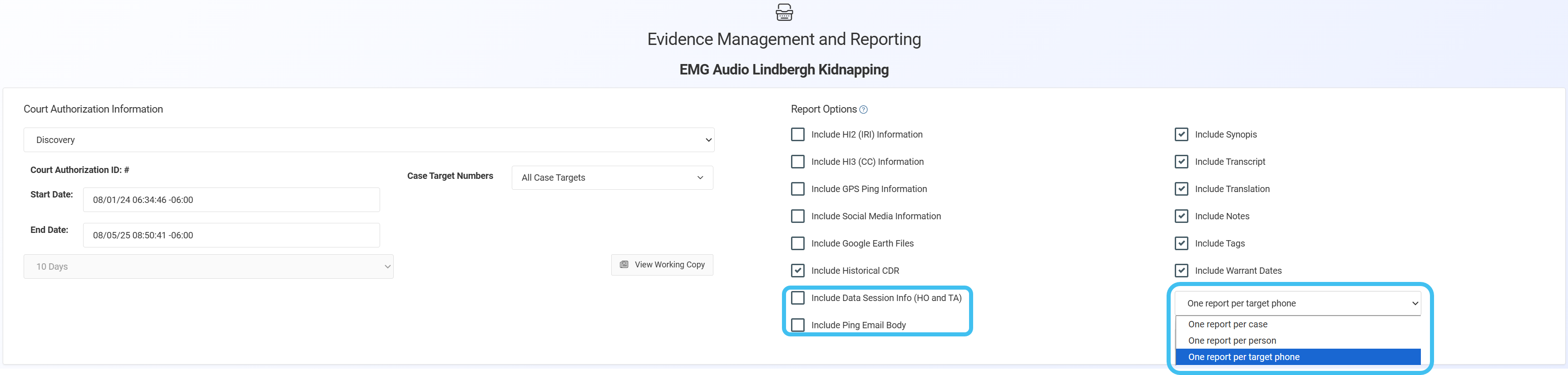 For historical CDR information, you can select whether or not to include the HO and TA data session information using the new Include Data Session Info (HO and TA) setting. Not including it reduces the amount of data significantly, resulting in the report completing more quickly, however by default it is selected. This same setting has been added to the Evidence Management and Reporting screen.