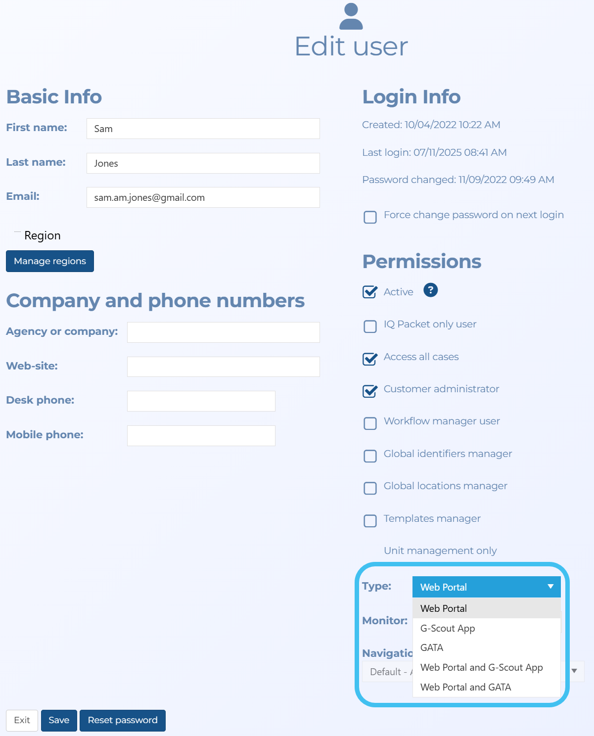 Customer administrators can now define in the new Type setting, on the Add/Edit user screen, what products a user is licensed to use.