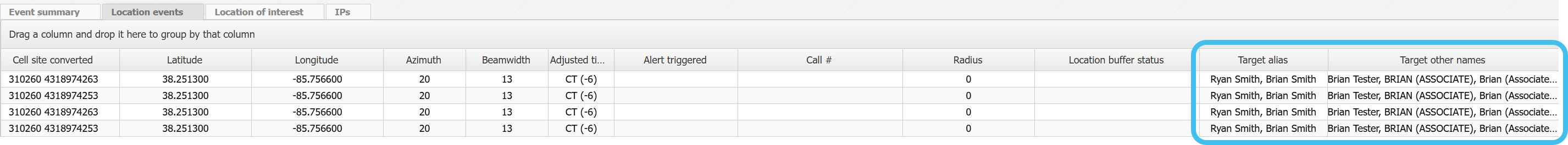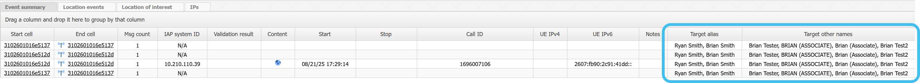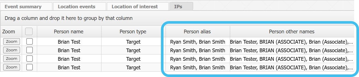 The Event summary, Location events and IPs views have been updated to now included a target's alias names and other names.