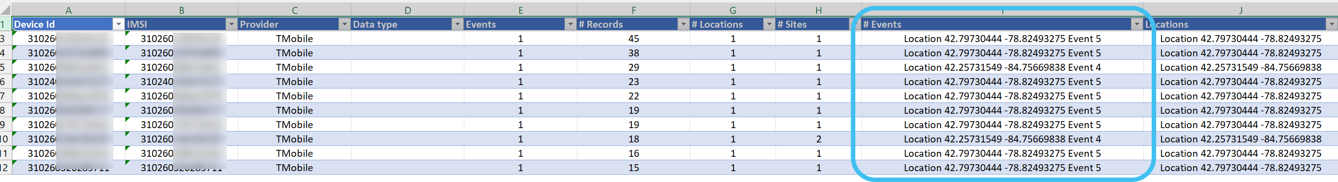 An Events column, listing the name of the events, has been added to the Target development (Through Geofence/Tower dump) IQ packet's Excel download.