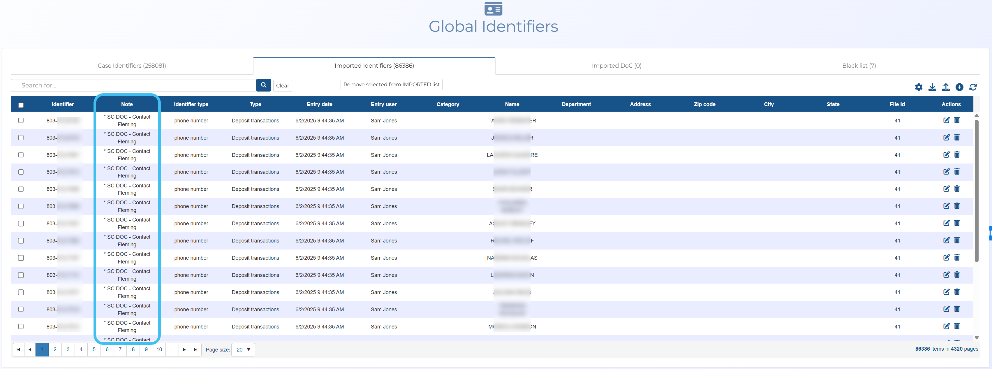 The note data is displayed on the Global identifiers screen's Imported identifiers tab in the new Note column.