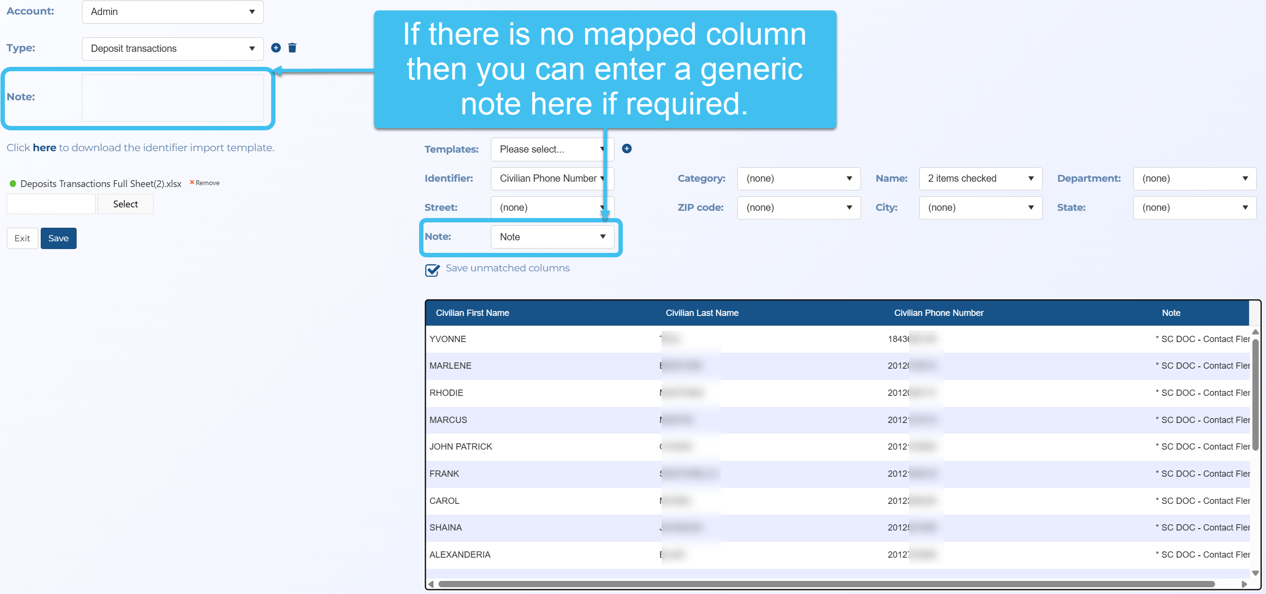 A new Note setting has been added to the Global identifiers upload screen so that you can map to the correct column in the file. Also, if you want the same note for every identifier rather than enter it for each identifier in the upload file, you can simply add it once to Note as shown below.