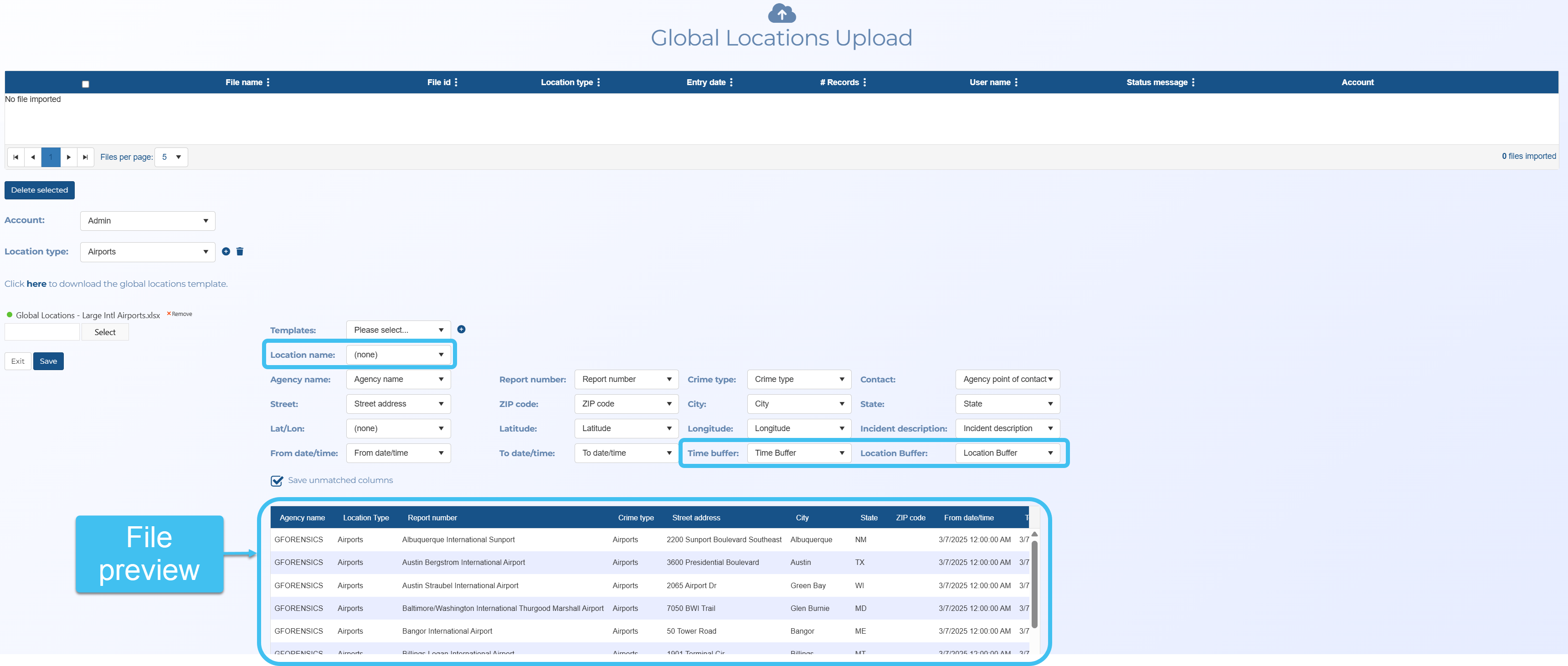 Three new mappings have been added to the Global locations upload screen. These are: Location name, Time buffer and Location buffer. A preview of the data in your selected file is now also displayed.