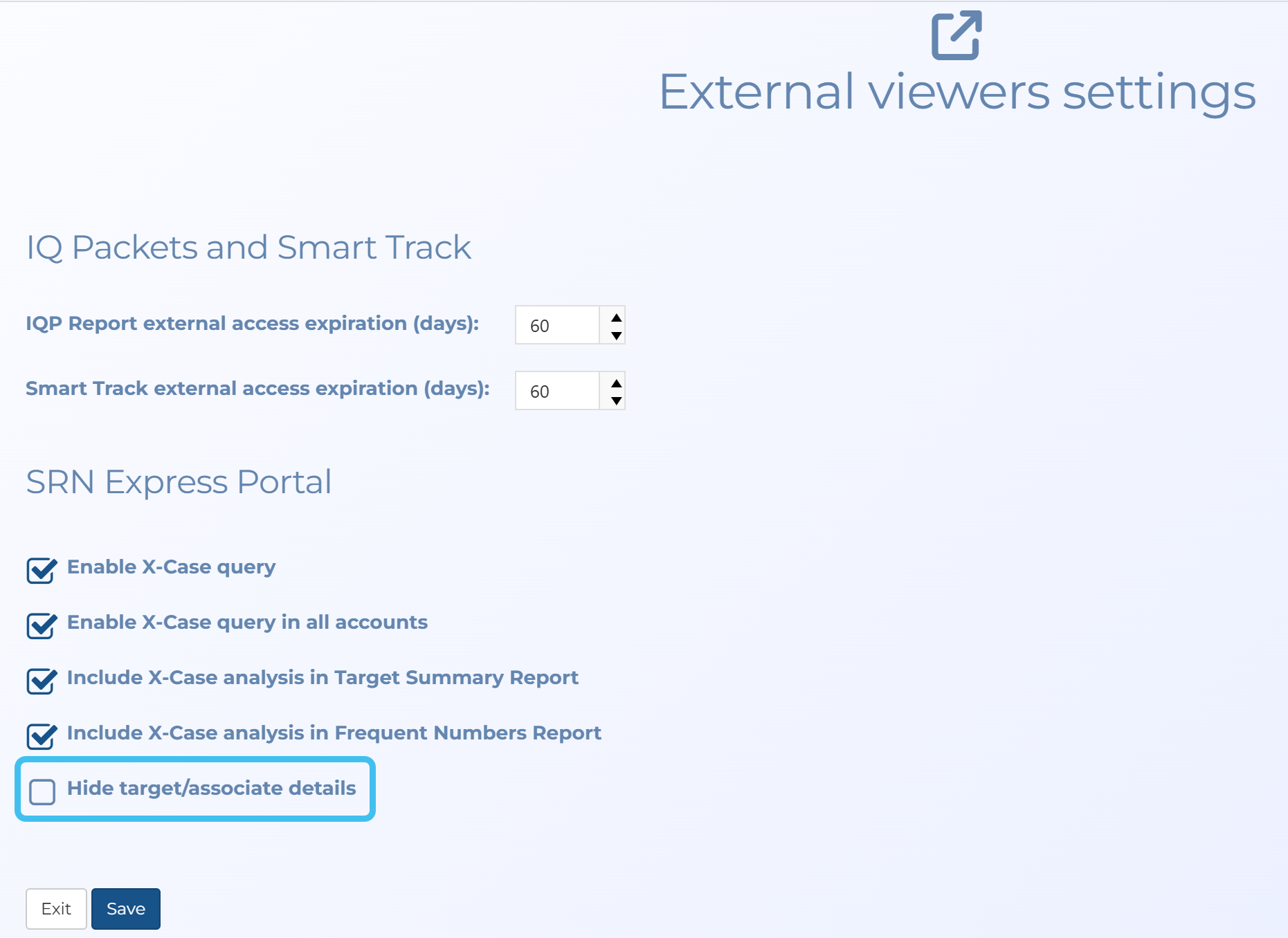 For administrators, a new Hide target/associate details setting has been added to the External viewers settings screen. Select if the only case information you want to include is the name of the case creator, their phone number and their email. If this is not selected then additional case details are provided.