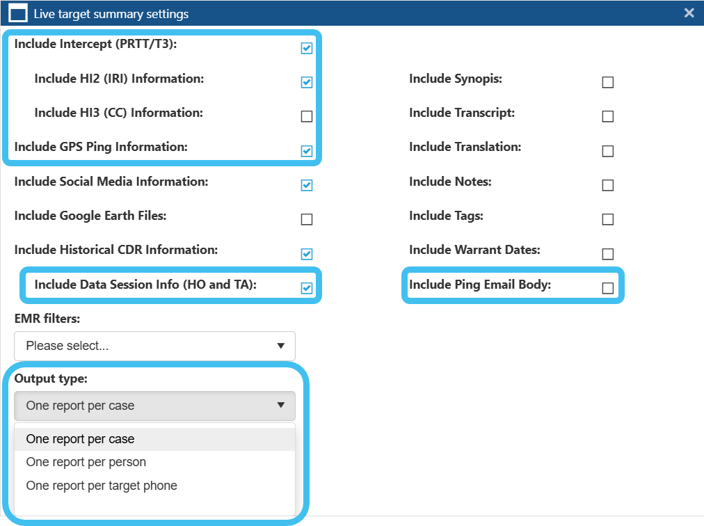 The new Output type setting allows you to choose what is included in a report either: one report per case, one report per person or one report per target phone. This same setting has been added to the Evidence Management and Reporting screen.