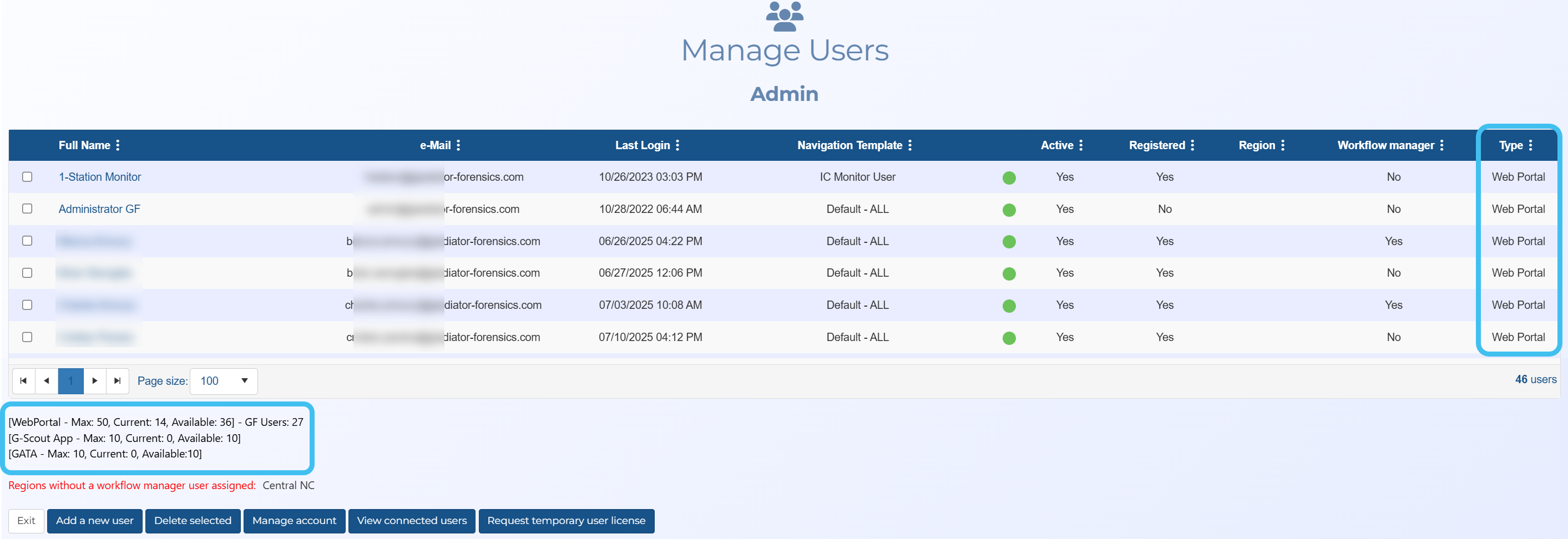 The Manage users screen now includes a new Type column displaying each user's product access. The summary under the table now lists the license usage summary for the three products.