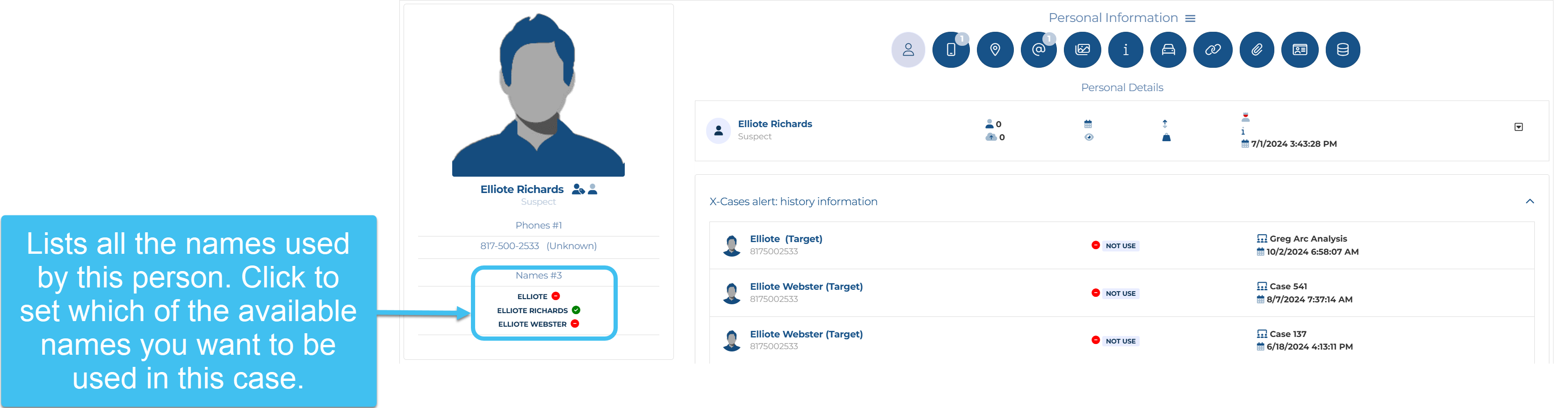 All the names available in OSS-ESPA for a person are now listed under their image, and you can now quickly select which one of these names you want to use in the case.