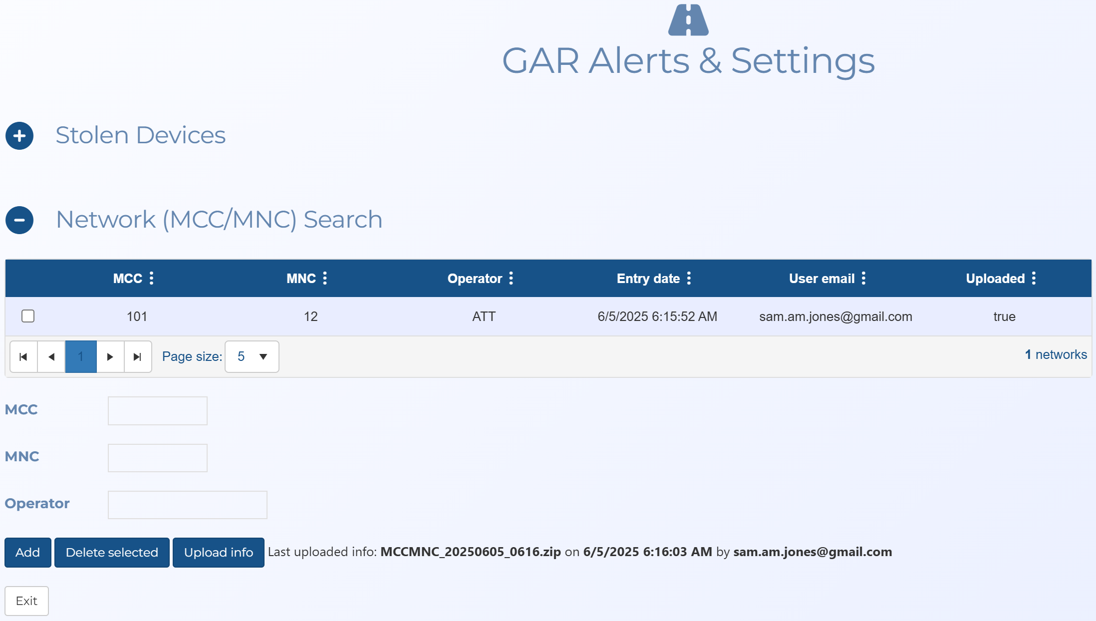 The Stolen device screen, used by administrators, has been renamed GAR alerts & settings. In addition to allowing you to upload stolen device files to GAR units, the screen now allows you to upload network searches based on the Mobile Country Code (MCC), Mobile Network Code (MNC) and the Operator.