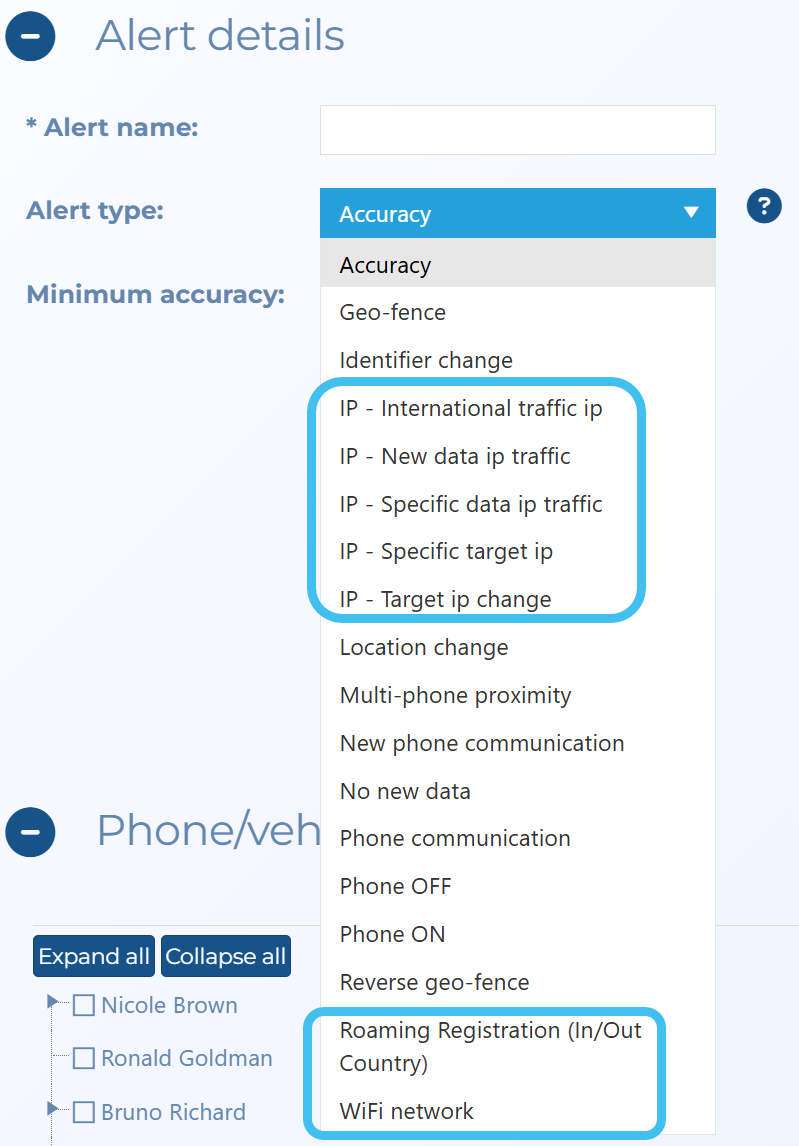 IP - New data IP traffic: select if you want to monitor when there is new IP traffic. For example, when a target accesses Facebook an alert is triggered, then if they access eBay another alert is triggered.