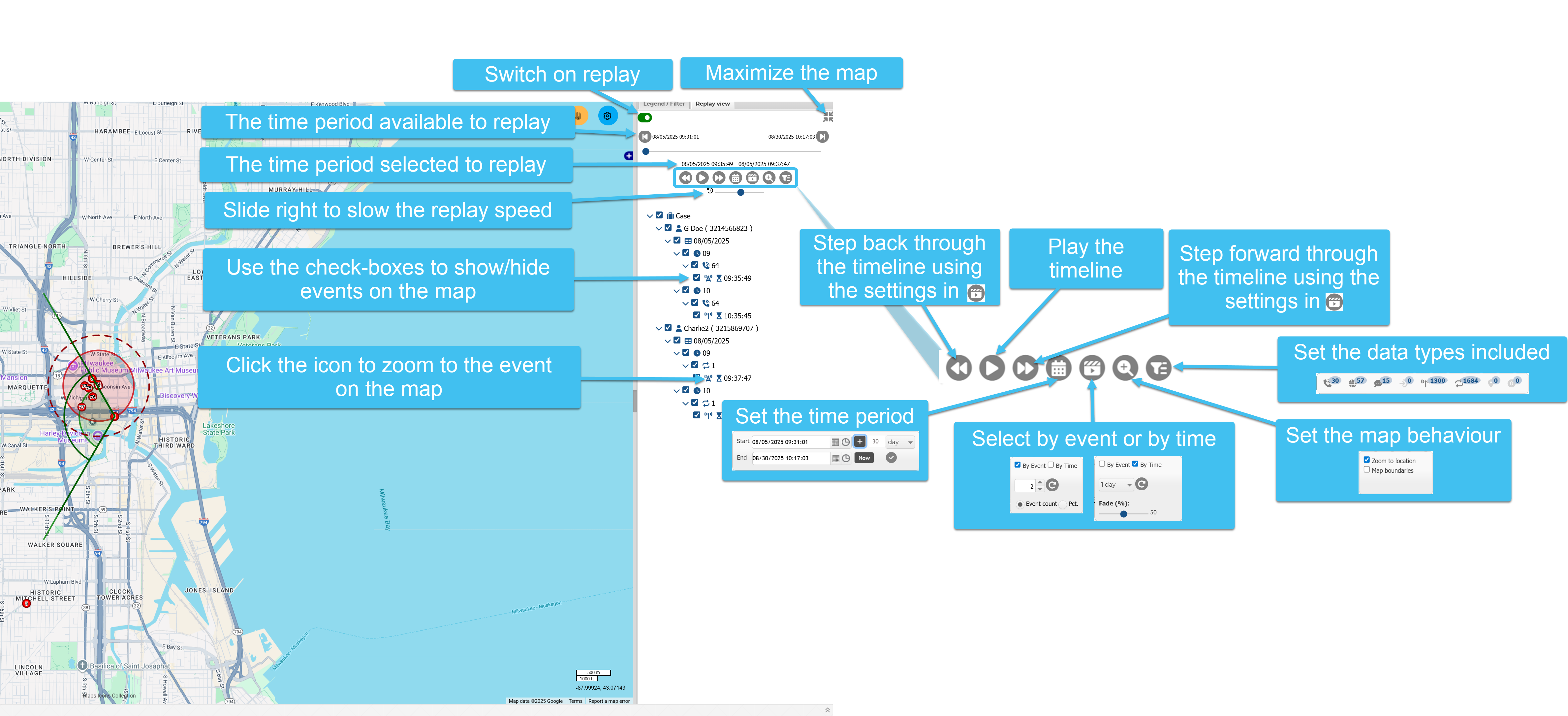 A new Replay view allows you to replay movements on the map of the ESPA analysis center screen. This can be useful if you want to display the movements of people around a specific location and time, for example the crime scene at the time of the crime. This replay feature includes all the events on one view, and provides flexibility on what is replayed, including which people, devices and the type of data. You can define the time period, whether data is loaded by events or time periods, and the speed that it is replayed. You can also select to step through the replay based on your setting configurations.