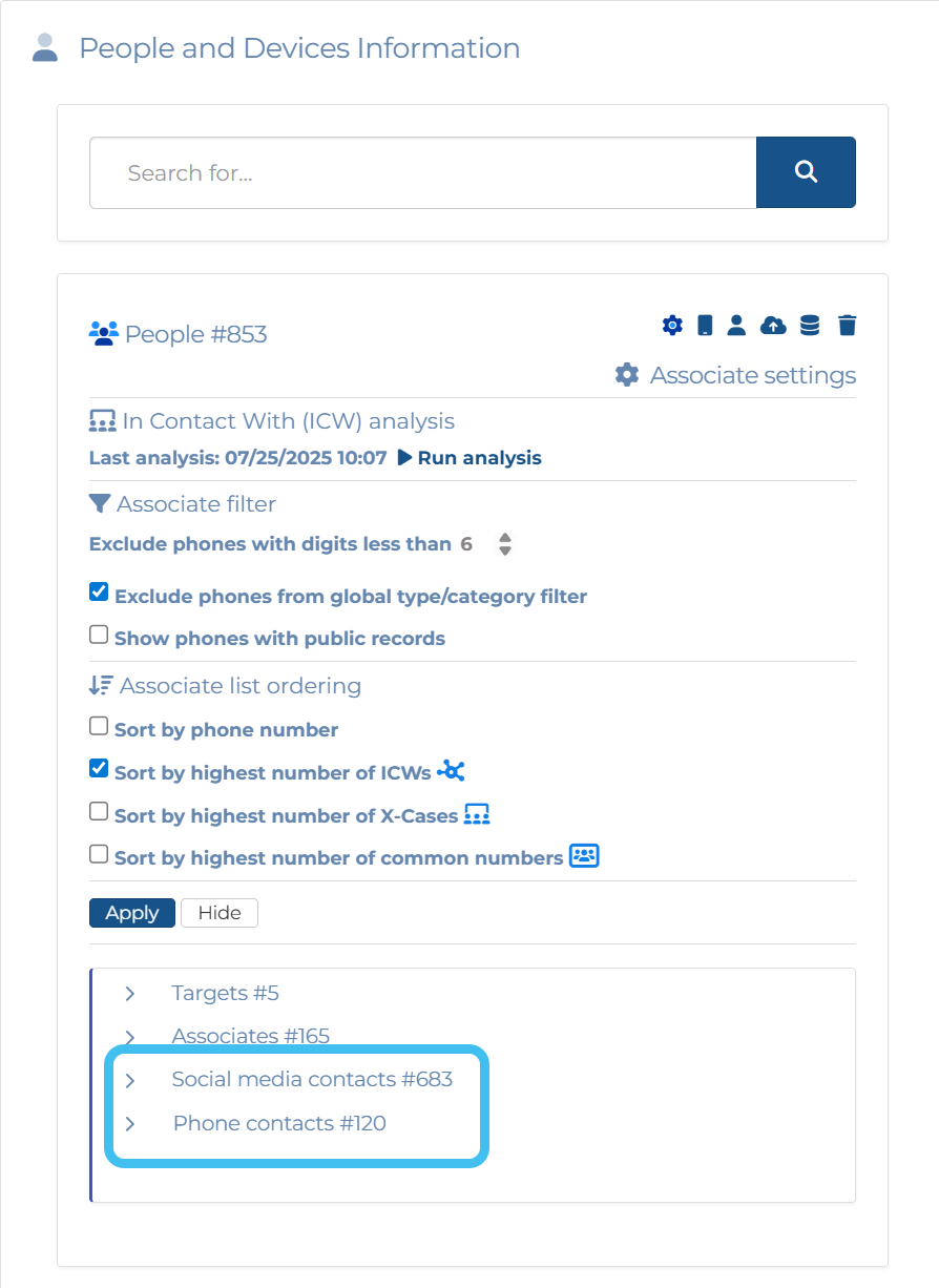 Two new groups have been created: Social media contacts and Phone contacts. The only contacts that are now listed in Associates are those from the CDR files.