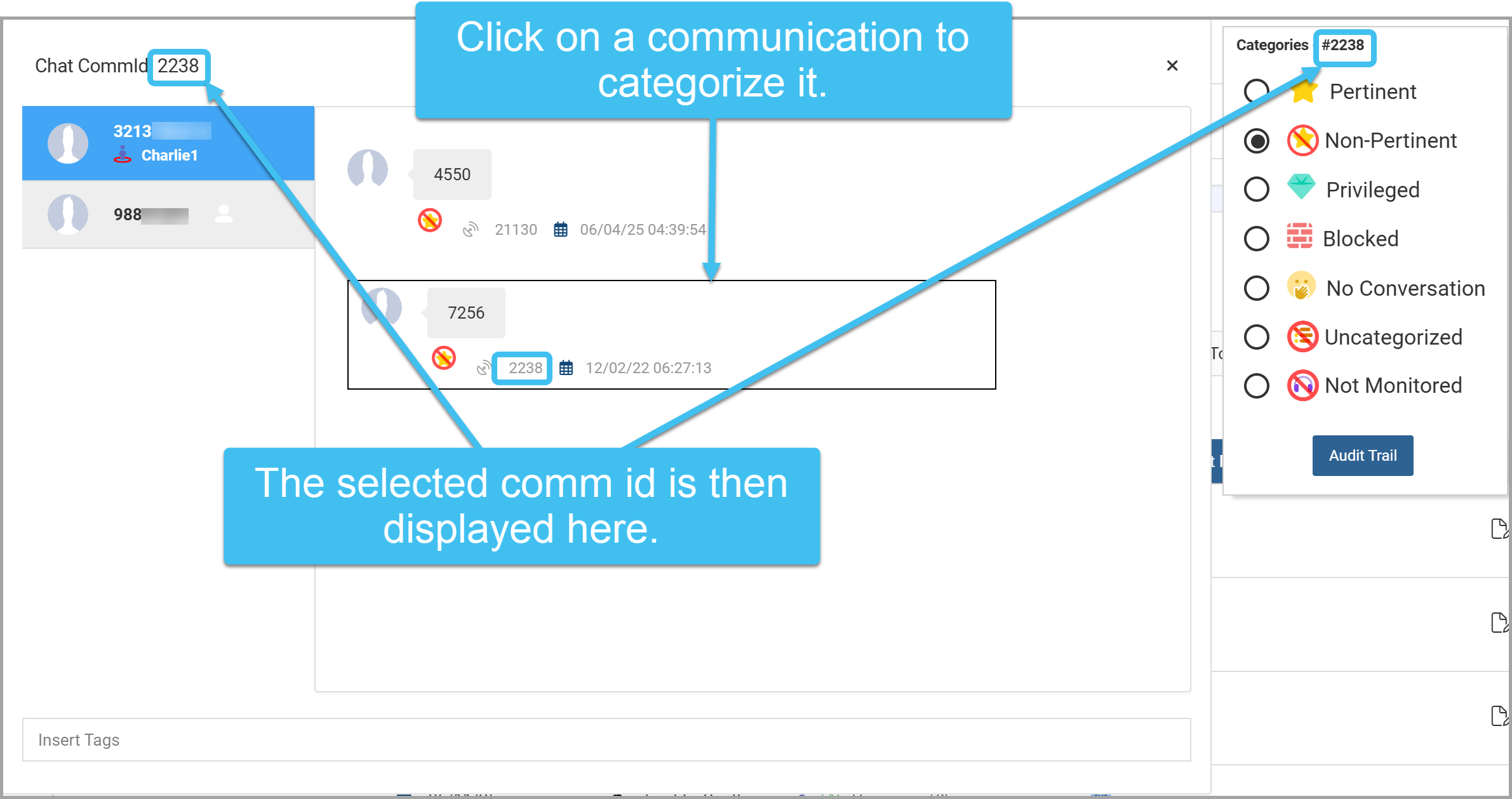 The Chat timeline view, on the Live monitoring and the Evidence Management and Reporting screens, now allows you to categorize each of the comm ids in the timeline, previously you could only categorize the comm id you first opened. To categorize each comm id, click on it; the selected comm id is displayed at the top-left of the Chat timeline view and at the top of the Categories window. You can then categorize it as normal.