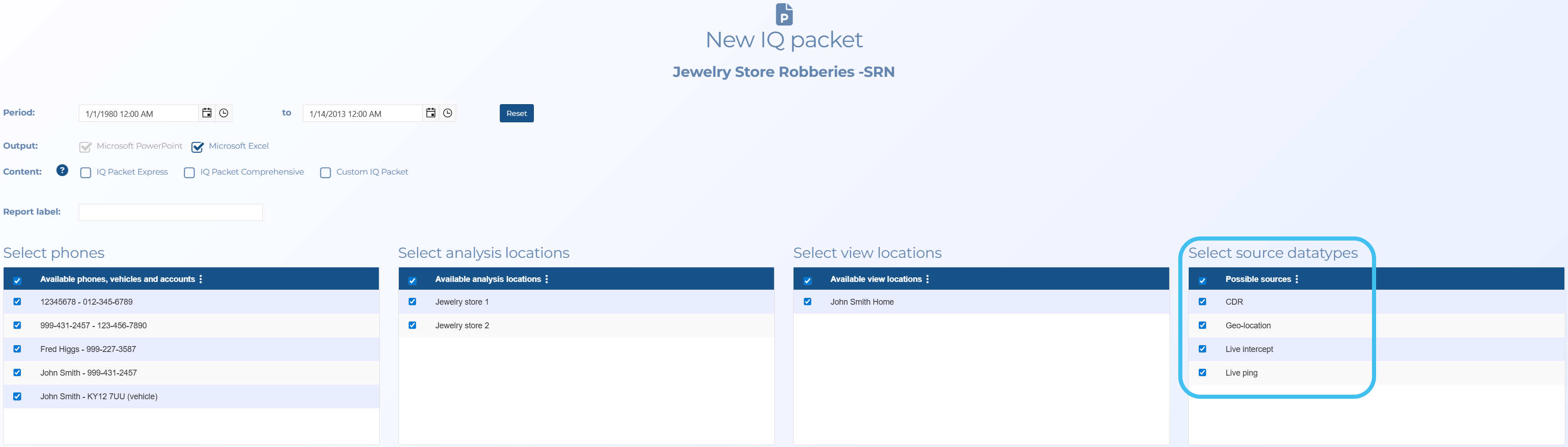 Select source datatypes has been added to the New IQ packet screen, allowing you to choose which sources of data are included in your report.