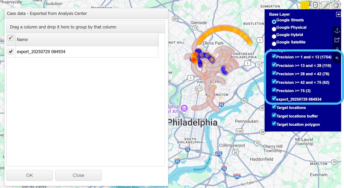 To view the precision analysis on the Sentinel screen, open the Case data dialog box and select the analysis export. You can then select which layers you want to view using the map layers.