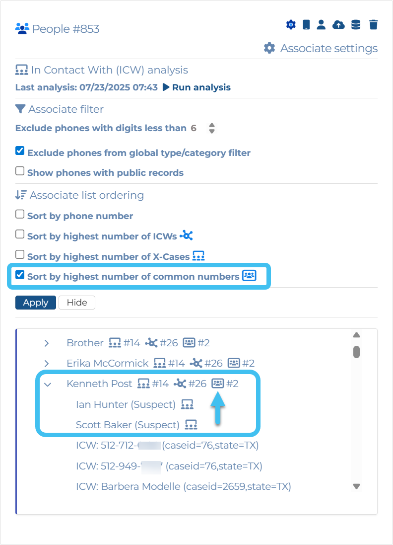 A Sort by highest number of common numbers setting has been added to the Associate settings so that you can now choose for the results to be ordered by the associate with the highest number of common target numbers. The number of common numbers is displayed alongside the associate number.