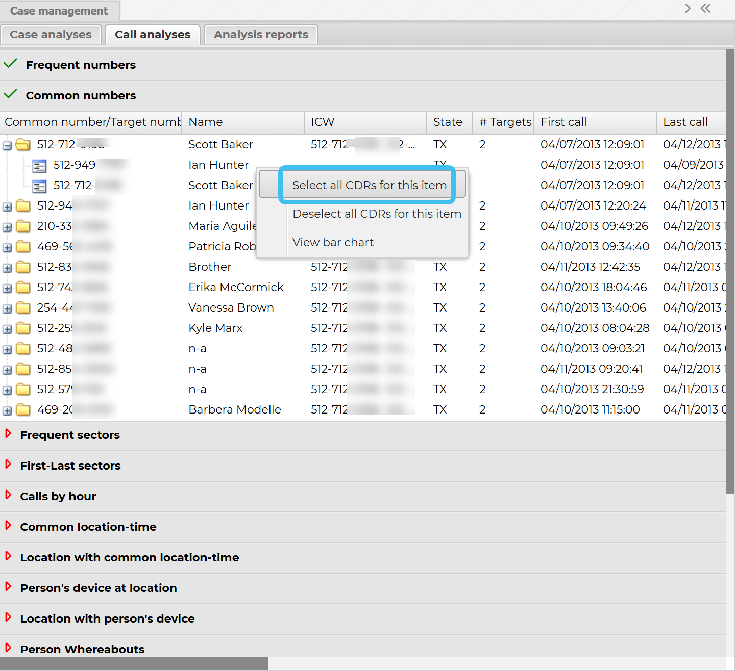 On the Call analyses tab right-click the common/target phone number combination you want to investigate further, then select Select all CDRs for this item. Note, if you require you can do this for more than one common/target phone number combination.