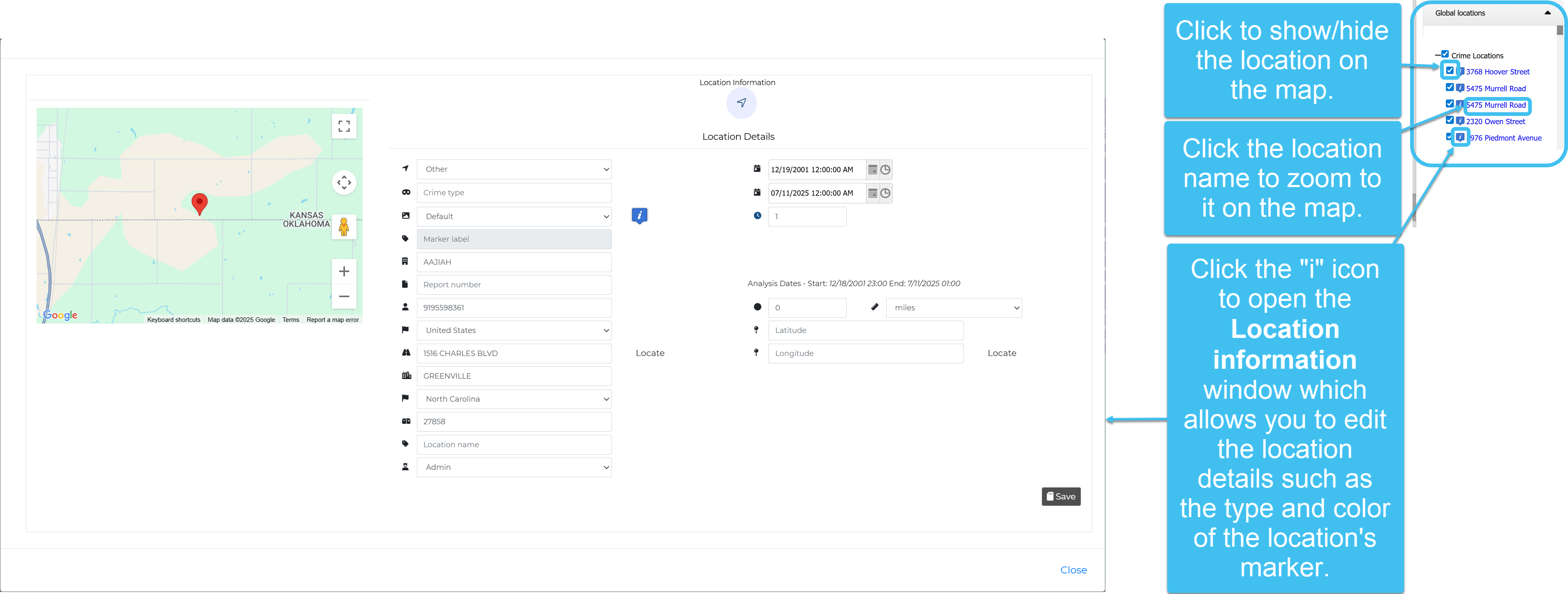 Using the Legend/Filter view you can drill down further to select the individual global locations you want to show/hide, zoom to a global location on the map, and open the Location information window which allows you to edit the global location details, such as the marker type and color.
