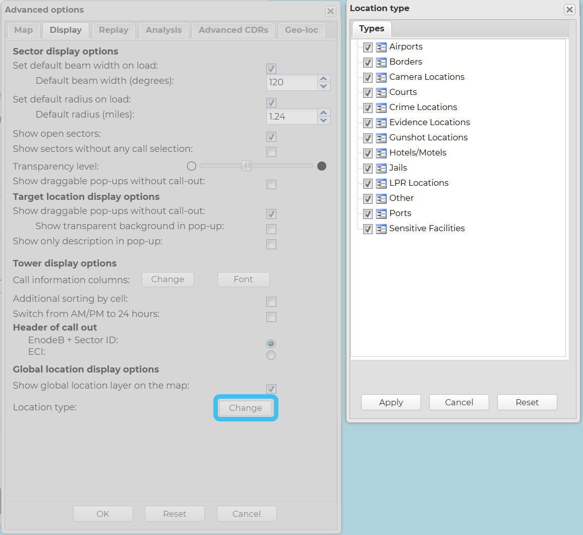 To view global locations on the ESPA analysis center: on the Display tab of the Advanced options dialog box ensure Show global location layer on the map is selected, and click Change to select the types of global locations you want displayed. You can also use Export map to Sentinel to view the global locations on the Sentinel screen.