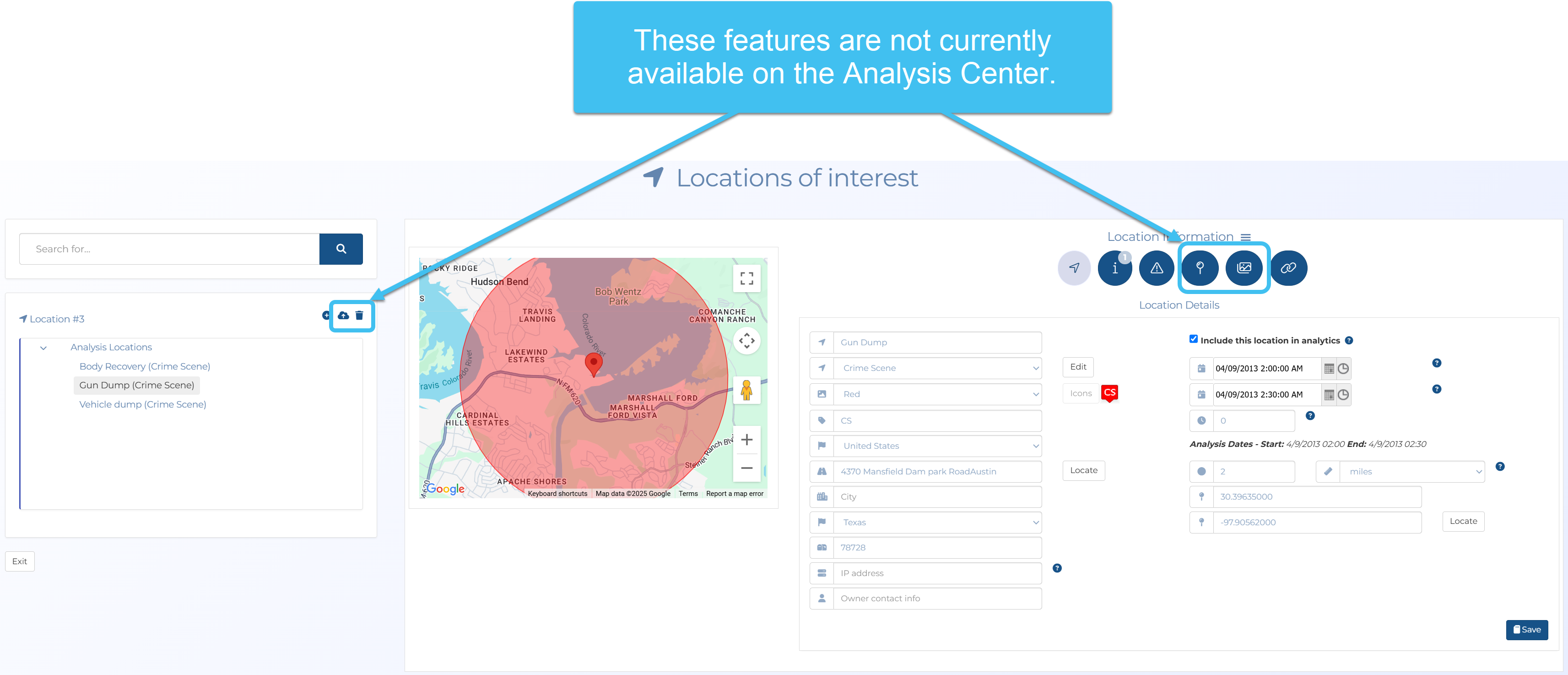 The ESPA analysis center's Locations tab allows you to view and edit the locations in the case, and add new locations, however currently it does not have all the features which are available on the Locations of interest screen, such as the ability to delete a location and upload a location file. You can also open the Location information window, which provides all the same features as on the Locations of interest screen with the exception of managing pictures and target development files.