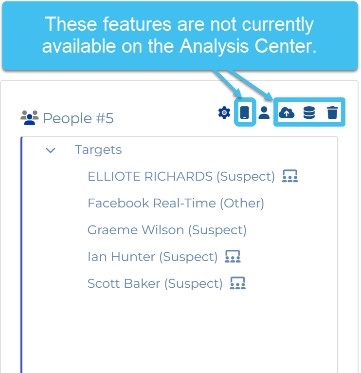 The ESPA analysis center's People and devices tab allows you to view and edit targets and their associates, and add new targets. It also allows you to view which targets in other cases the associate has also been in contact with (ICW).