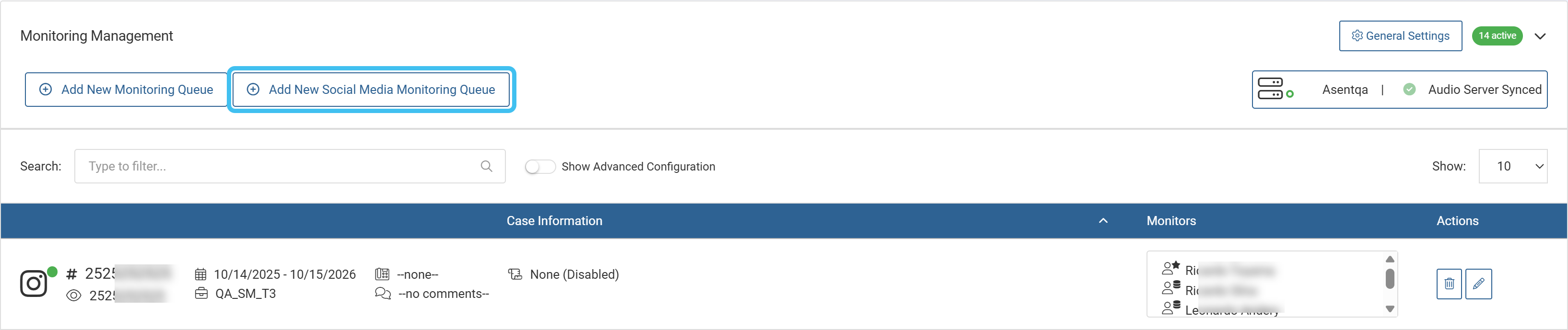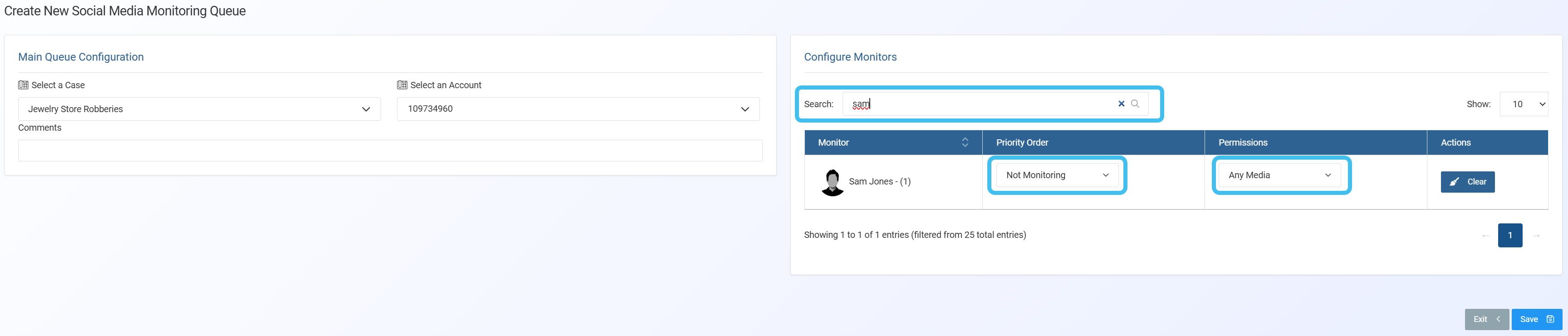 This topic describes how to create and configure a monitoring queue for the target's social media account. To creating a monitoring queue for their voice data or text, refer to How to create a monitoring queue.