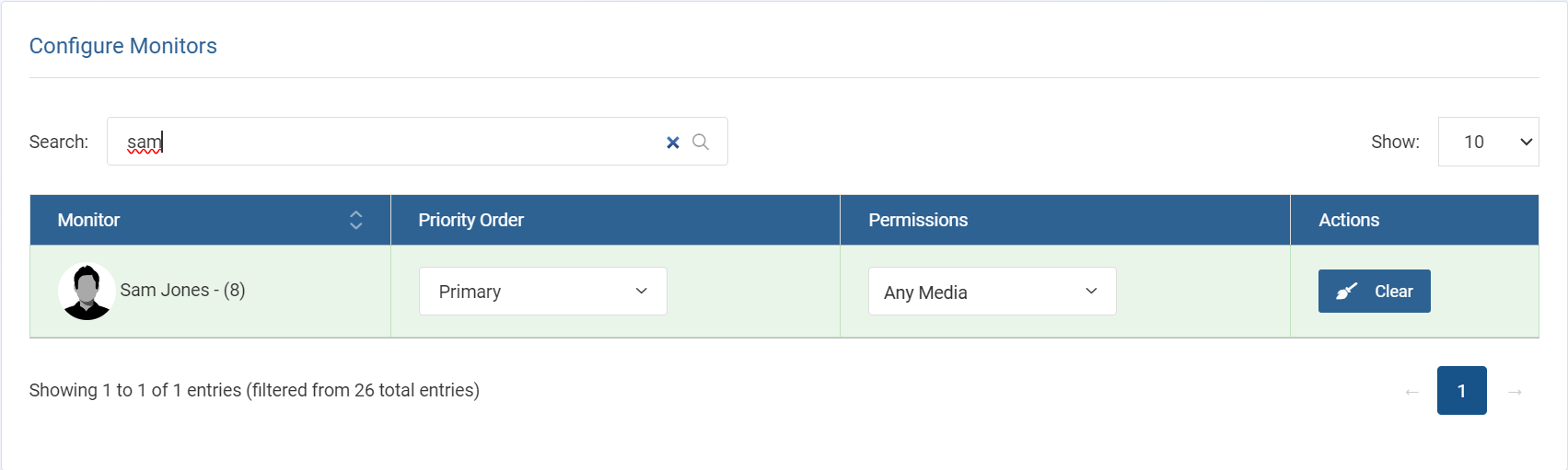 In Search, depending on whether you are setting up an individual user or a station, enter either the name of the monitor or the name of the station. The names that are available to select are those who have been set up to monitor as a User or as a Station by your administrator.