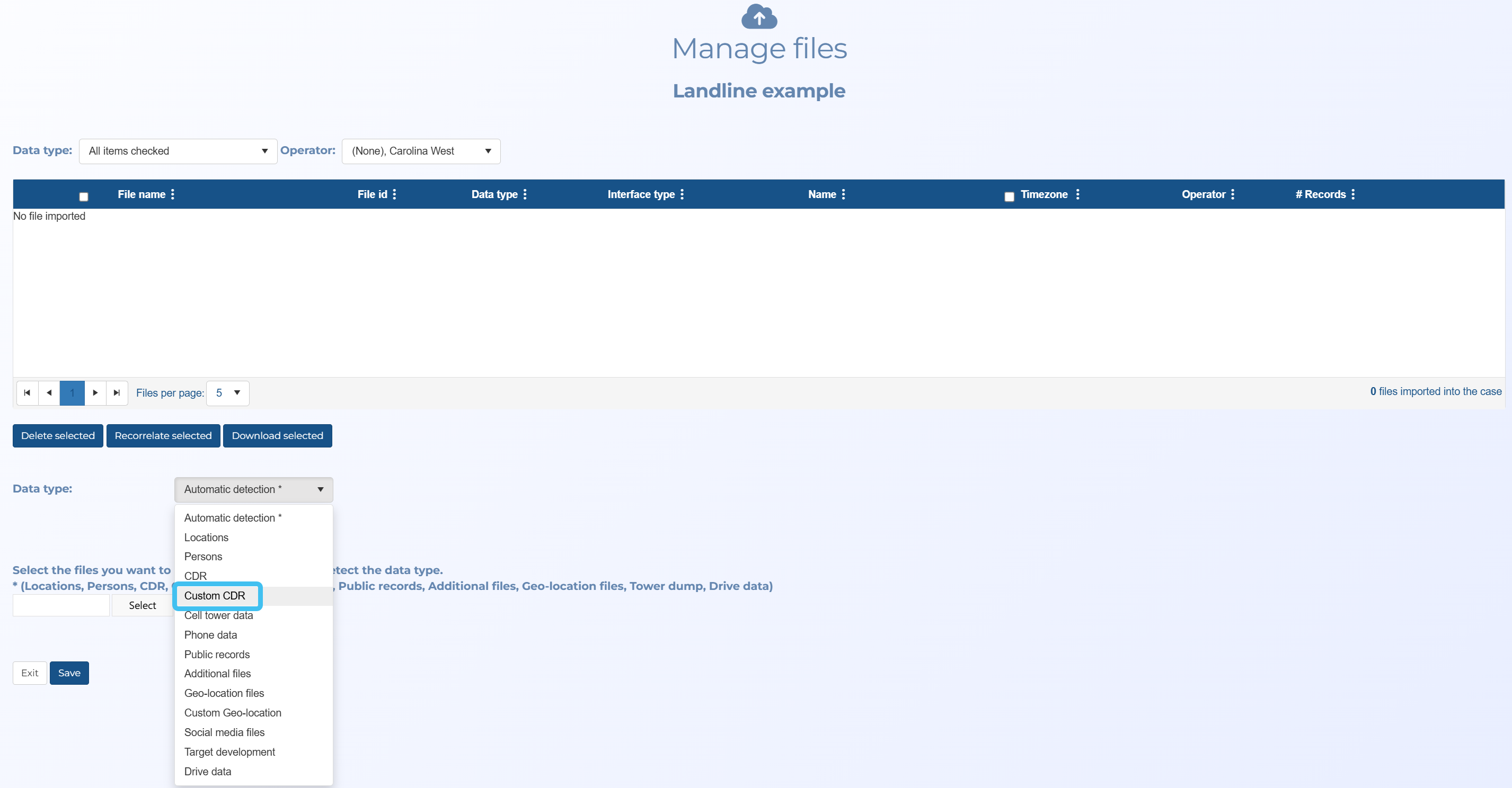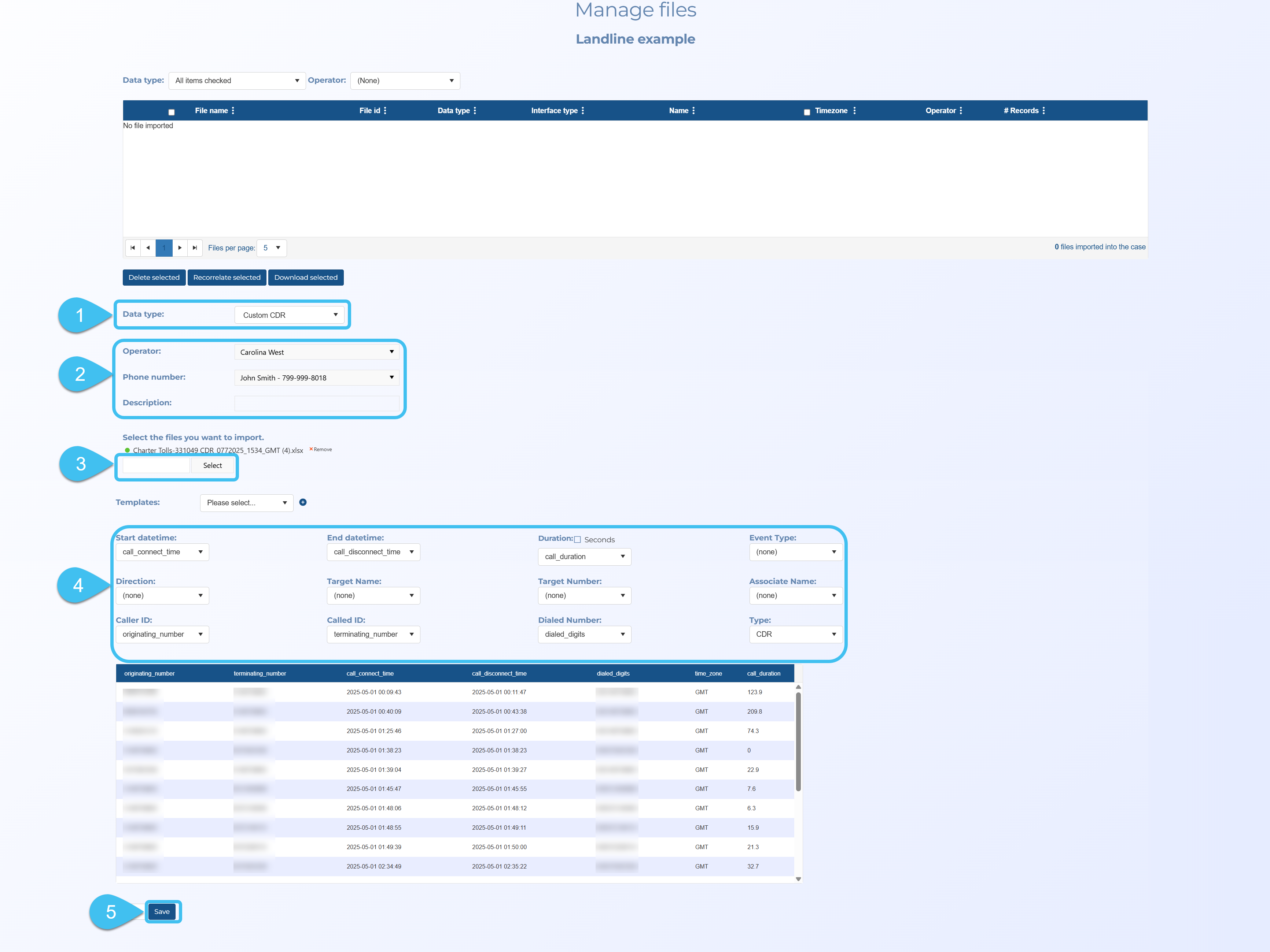 First you must create a person with their phone number, then you can import the file on the Manage files screen when Data type is set to Custom CDR. Once the file is uploaded, ensure Start datetime, End datetime, Duration, Originating number, Terminating number and Dialed number are all mapped to a column in the uploaded file as these columns are mandatory. After importing, you can then view the data on the ESPA analysis center's CDR data tab.