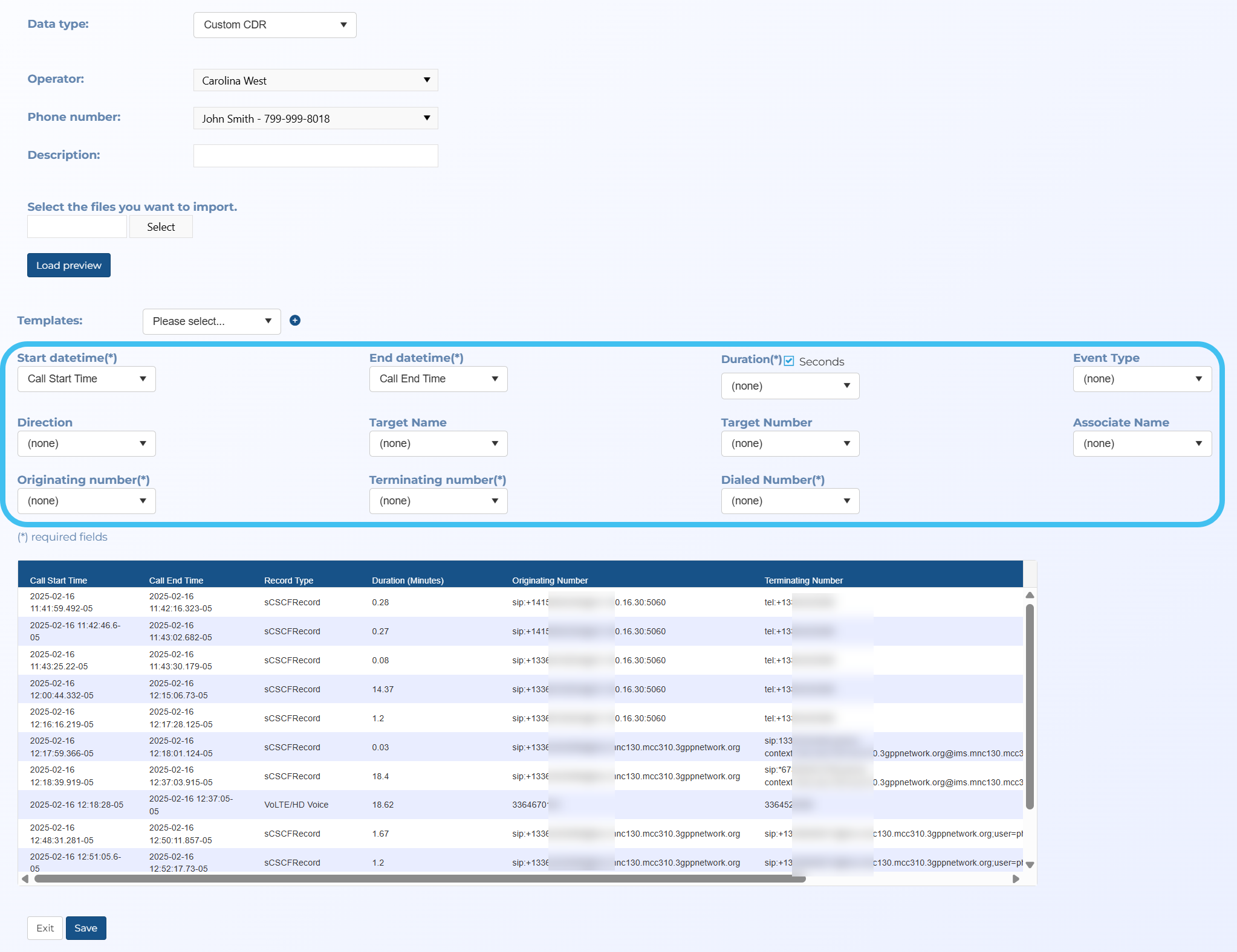 8. Ensure Start datetime, End datetime, Duration, Originating number, Terminating number and Dialed number are all mapped to a column in the uploaded file as these columns are mandatory. A preview of the uploaded file is displayed at the bottom of the screen to help you map to the appropriate columns.