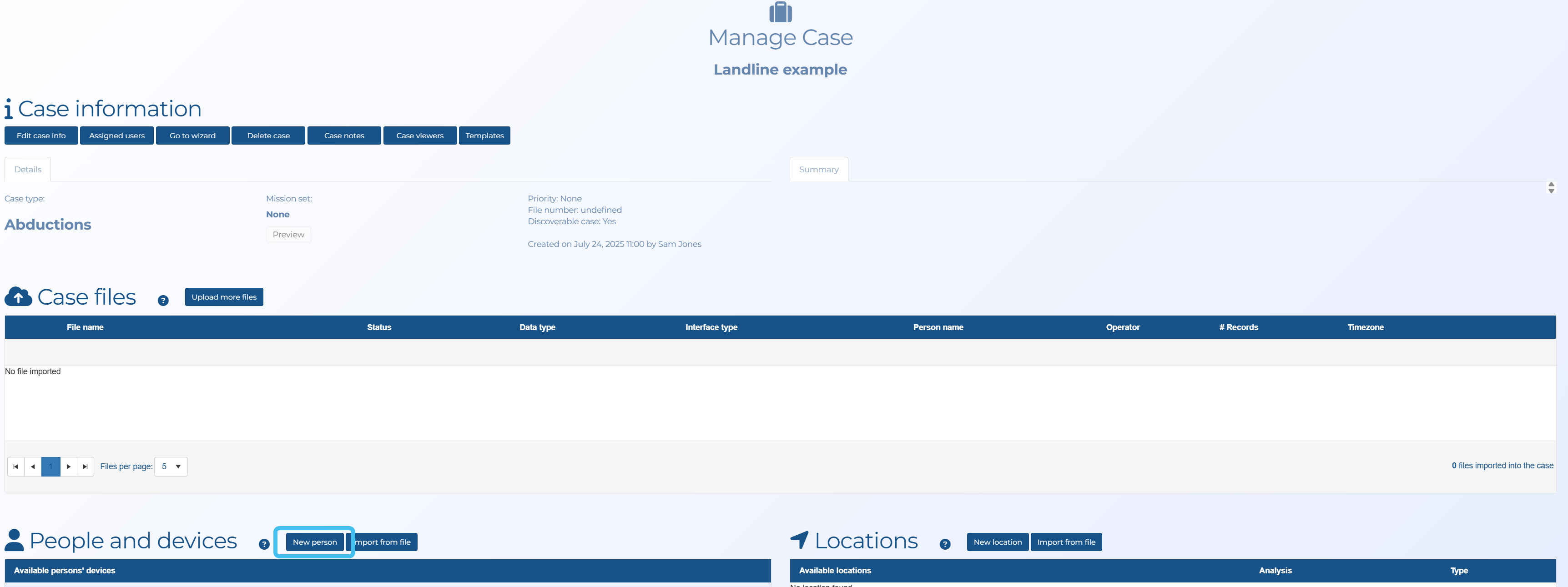 2. On the Manage case screen click New person, then enter the person and phone number.