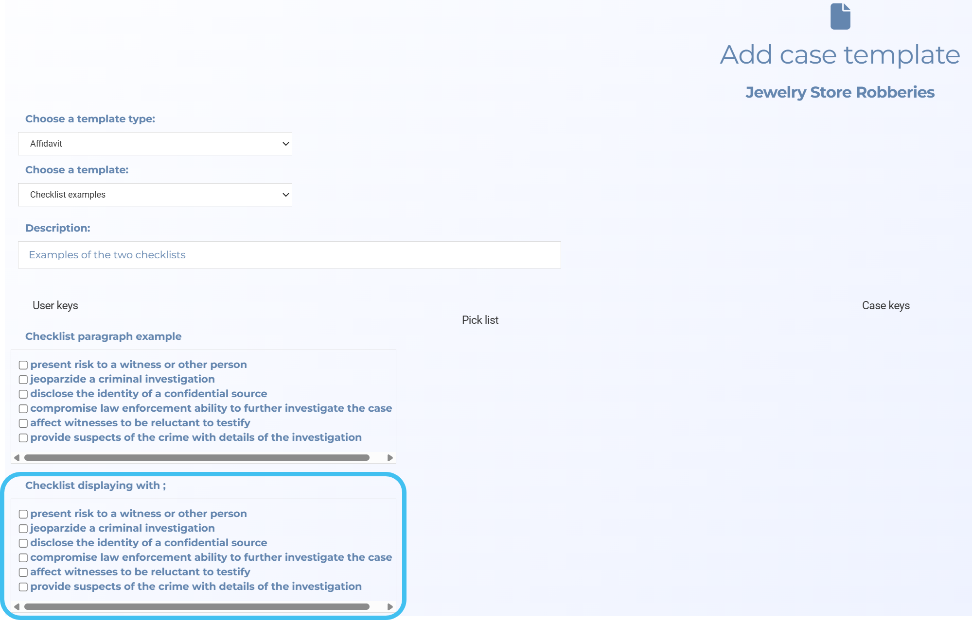 User and Case and Key data type is set to Check list with separator. It allows you to enter the character that you want to use to separate the information, for example a colon, semicolon and comma.