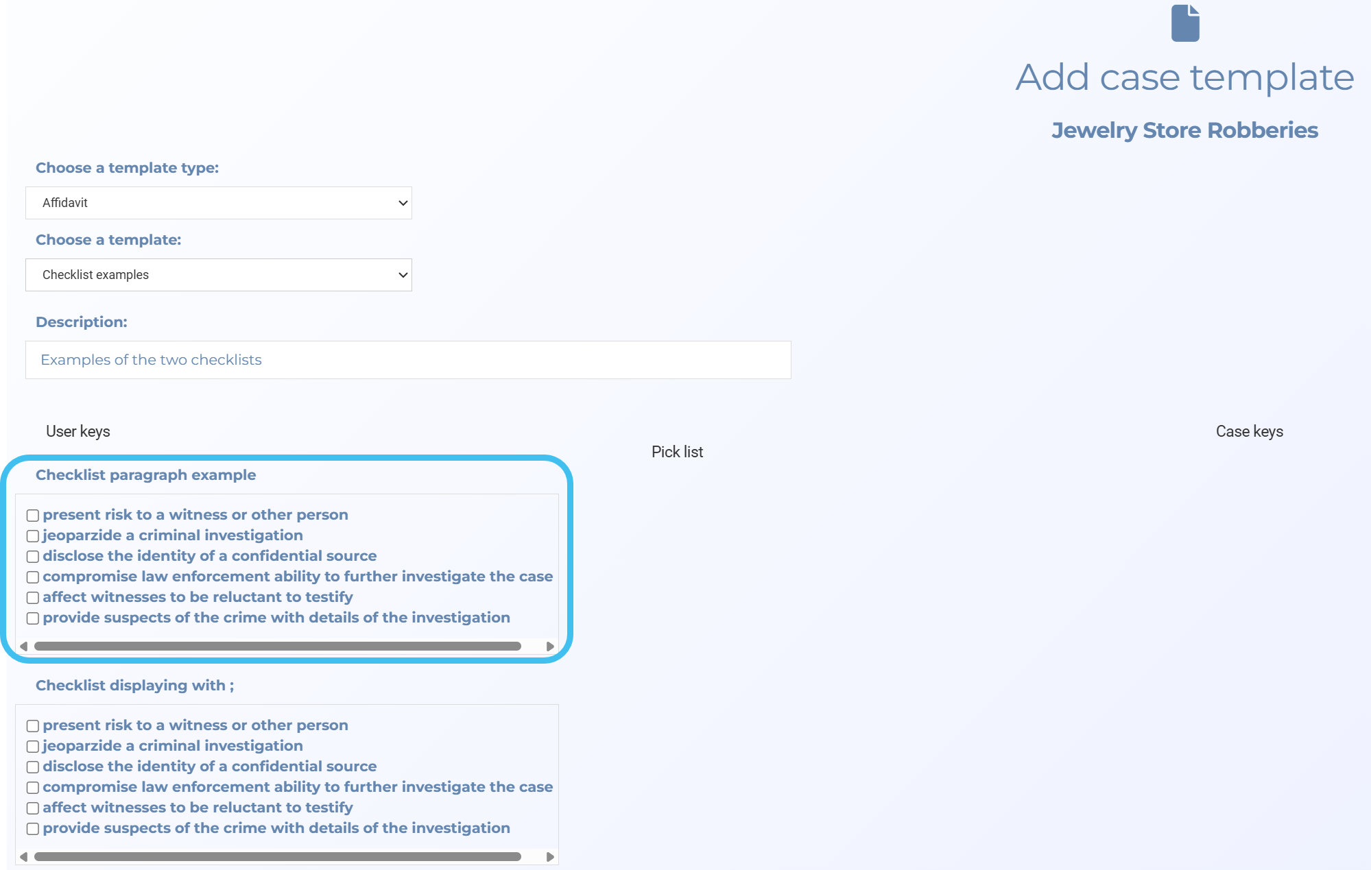 Case: use this for information that is specific to an investigation. This provides a section in the template for the user to manually complete details such as a report number, target phone number, service provider, date of records, and statement of probable cause. When this option is selected you can choose whether the user requires a small or large text box for the information using Key data type.