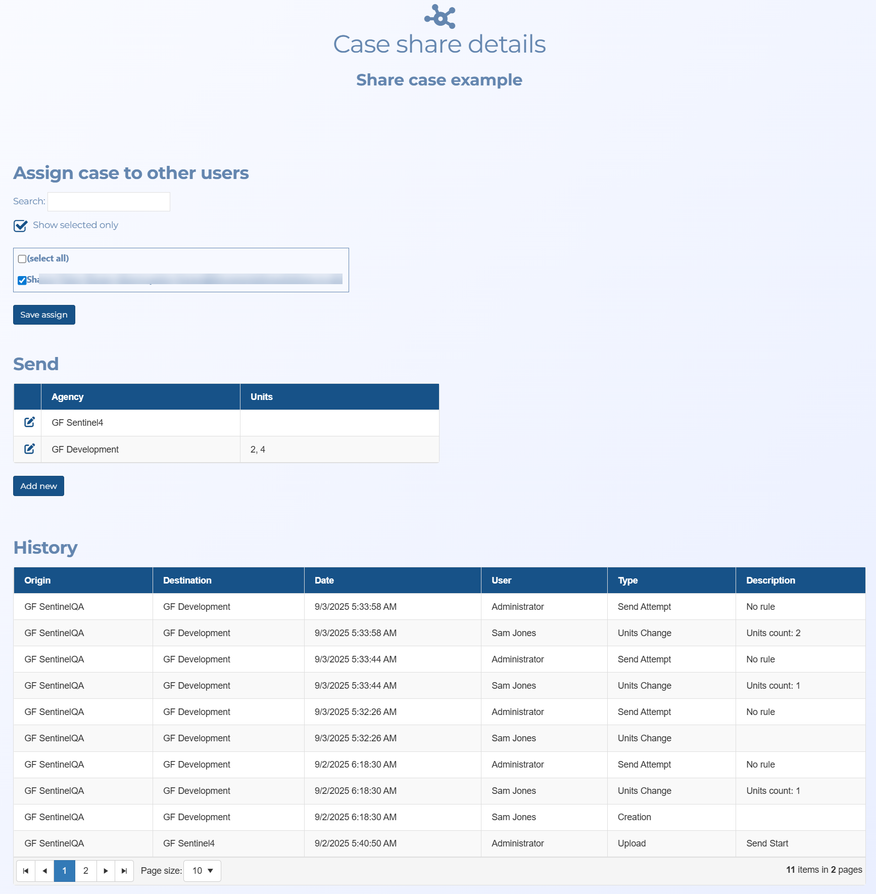 If you are sharing the case data with other agencies and field units this section displays a table listing them. Click Add new to open the Add case share screen which allows you to share the case data.