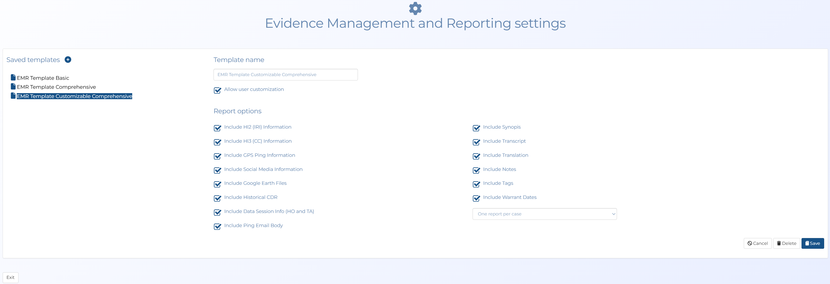 This topic describes the purpose of the Evidence Management and Reporting Settings screen and all the settings and buttons on it. However if you require step-by-step procedures on creating report templates refer to Managing Evidence Management and Reporting templates.