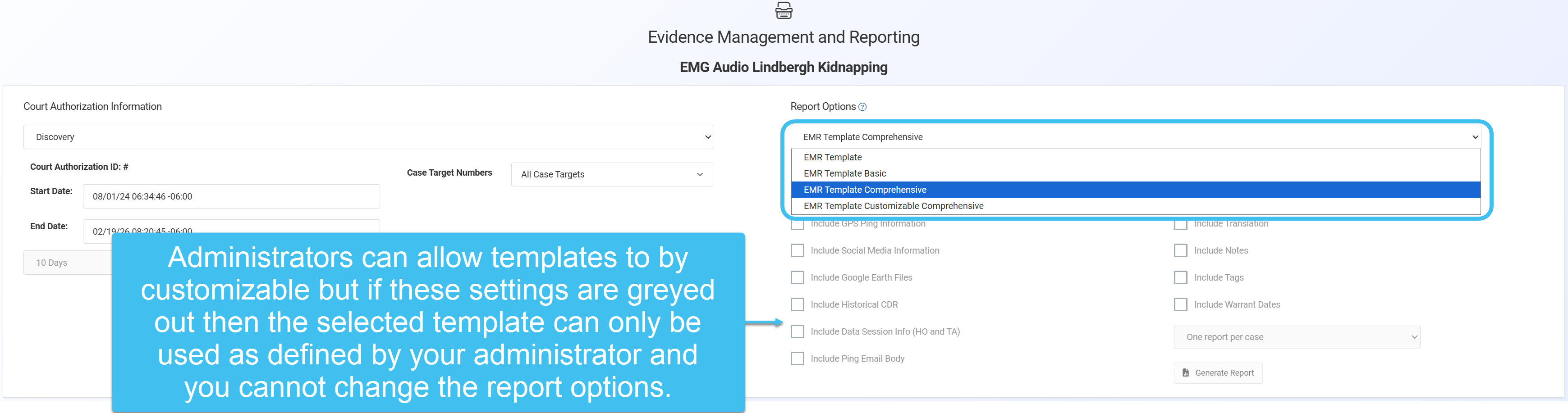 Once created, the templates are available on the Evidence Management and Reporting screen for users to select.